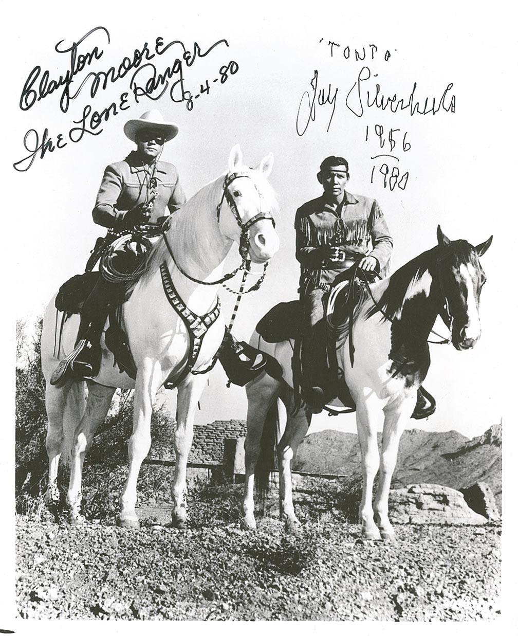 Glossy 8 x 10 photo of the Lone Ranger and Tonto on their mounts, signed in black felt tip “Clayton Moore, The Lone Ranger 8-4-80” and post-stroke “‘Tonto’ Jay Silverheels 1956/1980.” In fine condition.