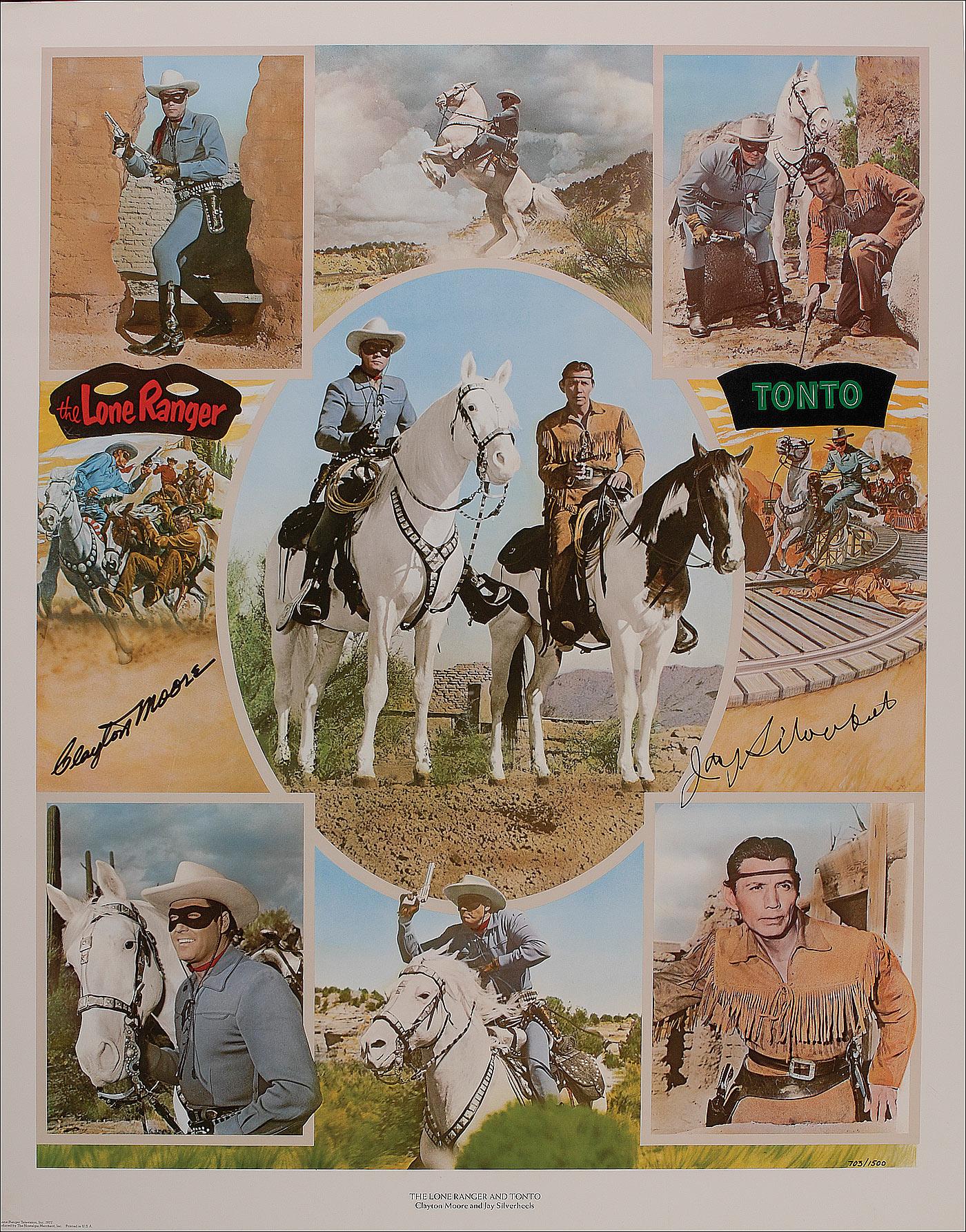 Beautiful color 24 x 30 limited-edition lithograph #703/1500, featuring nine great images, signed in black felt tip by Clayton Moore and Jay Silverheels. Rolled and in fine condition.