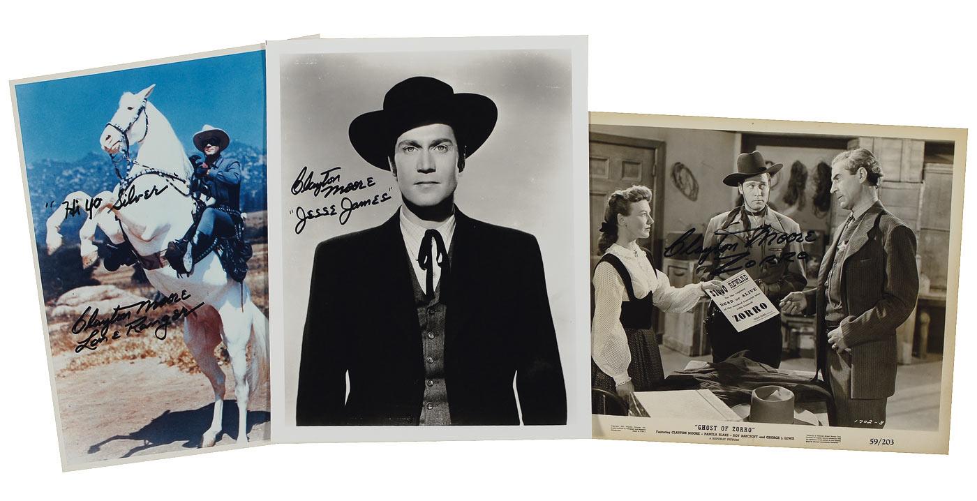 Three glossy signed photos, two 8 x 10 and one 10 x 8, including one color, of Moore as The Lone Ranger, Jesse James, and Zorro, each signed in black felt tip by Moore, adding his respective character name to each. In fine condition.