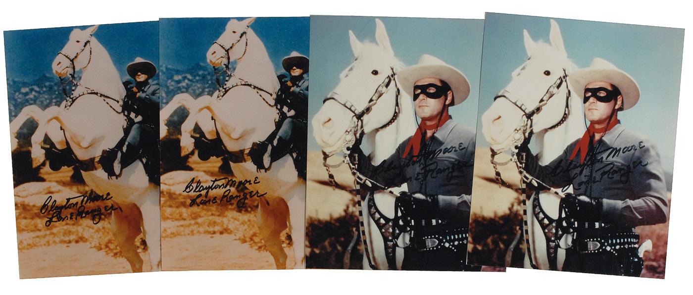 Four color glossy 8 x 10 photos of the Lone Ranger and Silver, each signed in black felt tip, “Clayton Moore, Lone Ranger.” In fine condition.