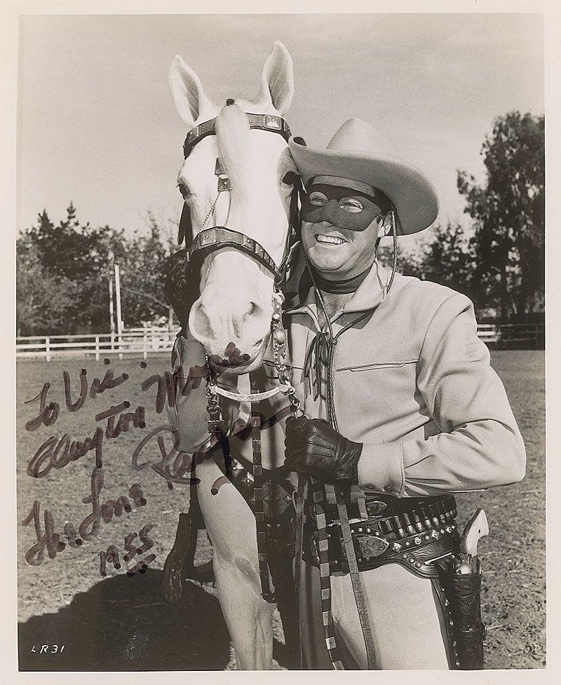 Vintage glossy 8 x 10 photo of Moore in character as the Lone Ranger with his horse Silver, signed and inscribed in black felt tip, “To Vic, Clayton Moore, The Lone Ranger, 1955.” In fine condition, with slight creases to corner tips. Originates from the personal collection of Victor Johnson, who worked as a gaffer at Warner Bros. for over forty years.