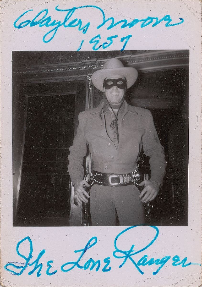 Wonderful vintage glossy 2.5 x 3.5 candid photo of Moore as the Lone Ranger, signed in the upper and lower borders in blue ink, “Clayton Moore, 1957, The Lone Ranger.” In fine condition.