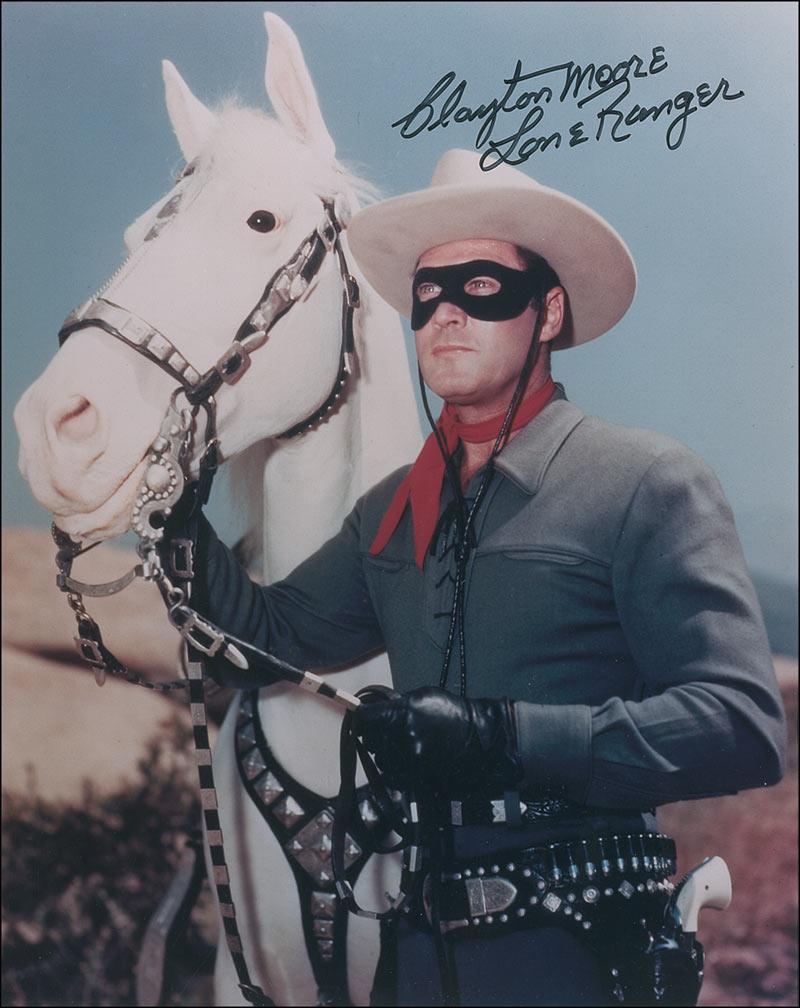 Color satin-finish 8 x 10 photo of the Masked Man with his white horse Silver, signed in black felt tip “Clayton Moore, Lone Ranger.” In fine condition.