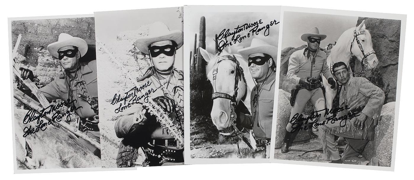 Four different glossy 8 x 10 photos of Moore as The Lone Ranger, each signed in black felt tip, “Clayton Moore, The Lone Ranger.” In fine condition.