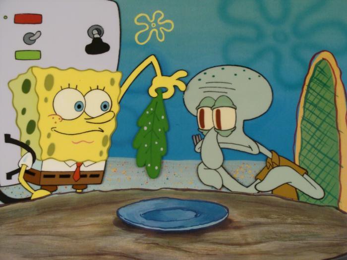 This animation cel and reproduction background are from the Nickelodeon TV show SpongeBob Squarepants. The story takes place under the deep blue sea in Bikini Bottom, where SpongeBob resides. SpongeBob, who is a yellow, porous sponge, is your typical happy-go-lucky character, as he is always cheerful and enjoys making people laugh. Patrick Star, SpongeBob's neighbor who is a starfish, is your average children's show idiot, as he boasts knowing nothing and is often getting himself into ridiculous situations. Between the homes of these two lies the home of the miserable Squidward, a squid, who is known for being grouchy and playing tricks on SpongeBob and Patrick. Both SpongeBob and Squidward work at the Krusty Krab, a fast food business run by the greedy money-loving Mr. Krabs, a crab, the arch rival of the evil, possibly misunderstood, Plankton. Another neighbor, Sandy Cheeks, an athletic squirrel who normally wears an astronaut's space suit, was introduced in "Tea at the Treedome." She spends most of her time inventing and experimenting. SpongeBob appears to be about to clean the leaf.Original Printed Background and Animated Cel Overall Size of Background: 11" x 17" Overall Size of the Cel: 10 1/2" x 12 1/2" Very good condition This is an original hand-painted cel set-up used in the production of an episode of "SpongeBob SquarePants." Each one-of-a-kind set-up represents a slight change in position of the characters. When individually photographed and projected in rapid succession, the images appear to move.