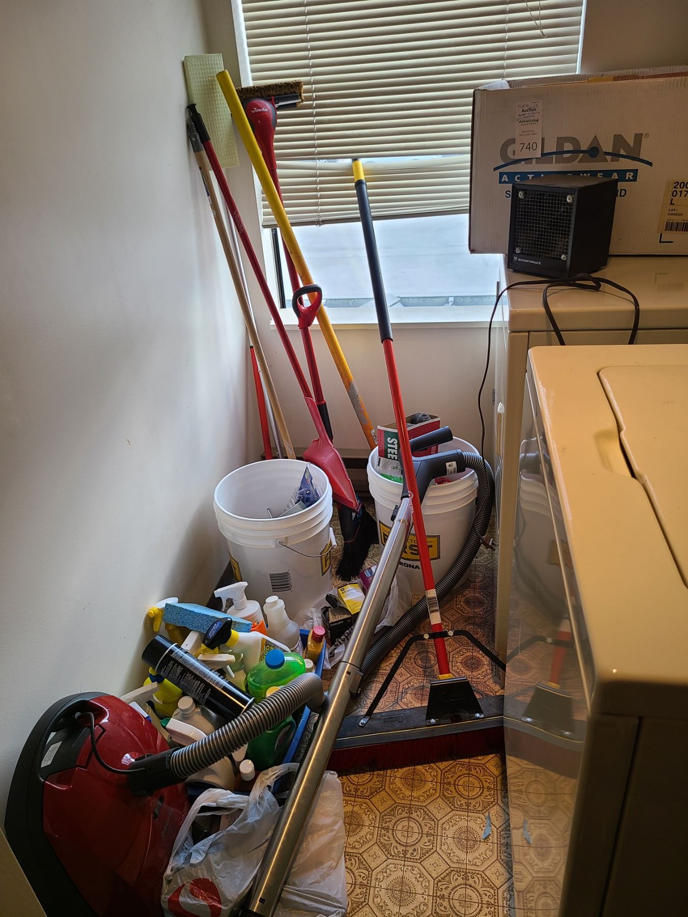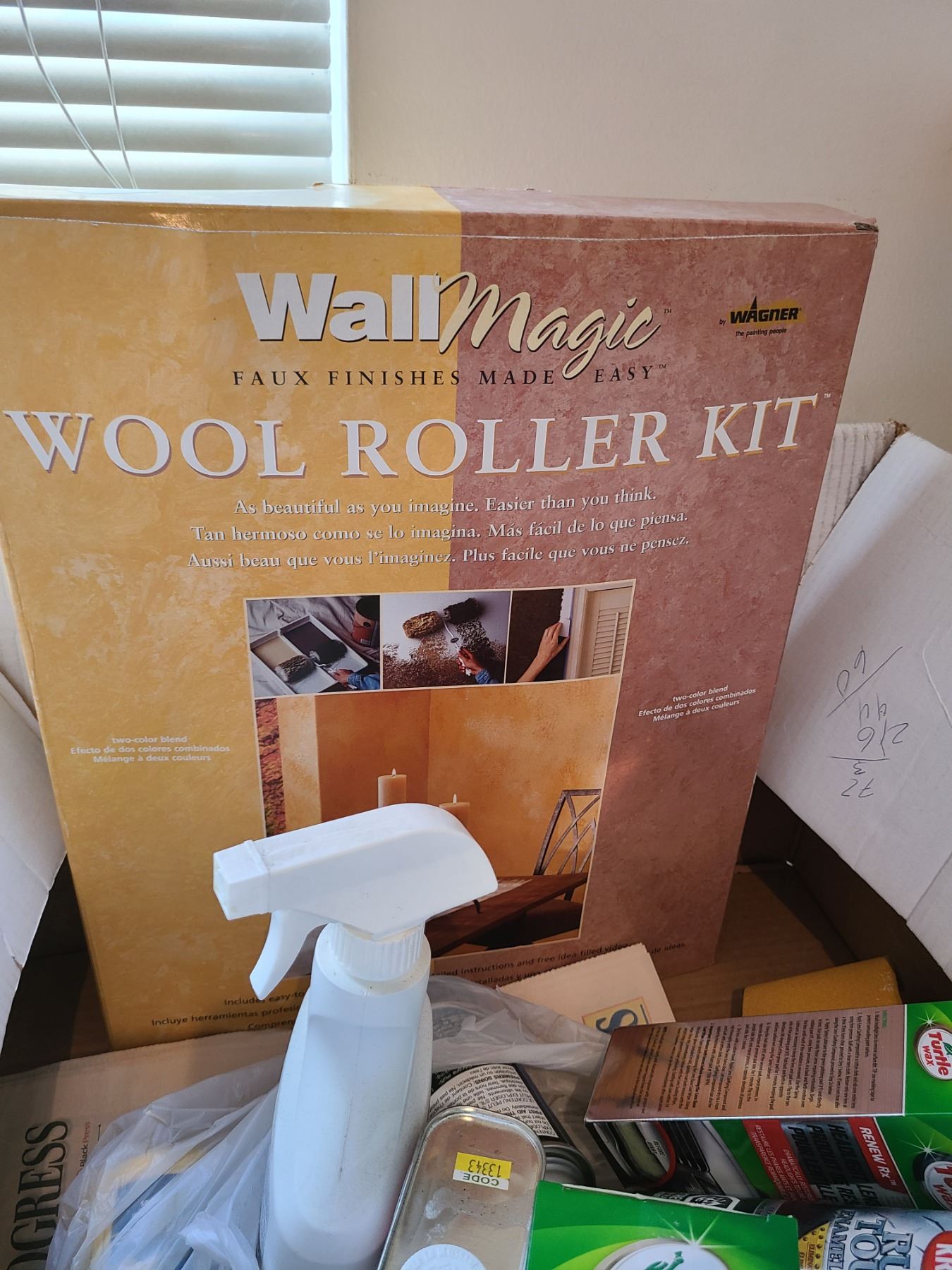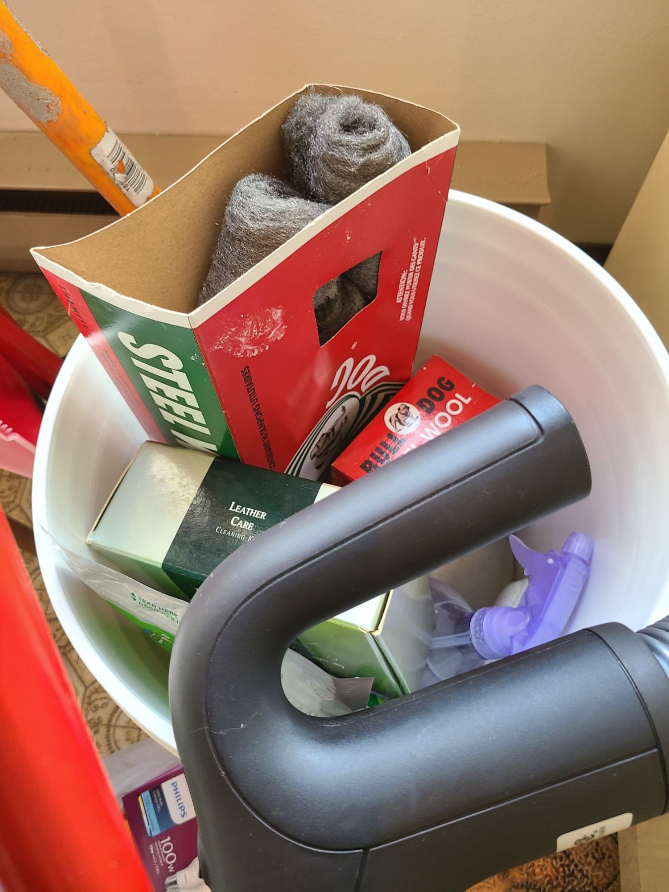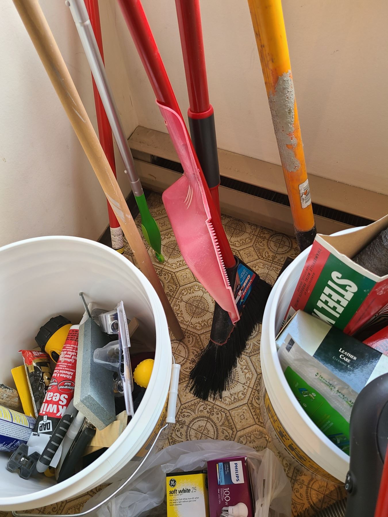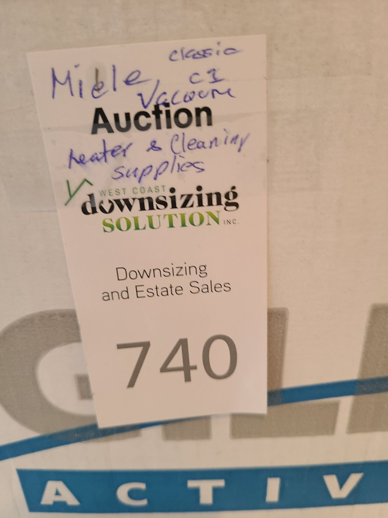 Lot includes Miele vacuum, brooms, cleaning material, paint items, and wool roller kit. Bring boxes. Pickup at 10 am.