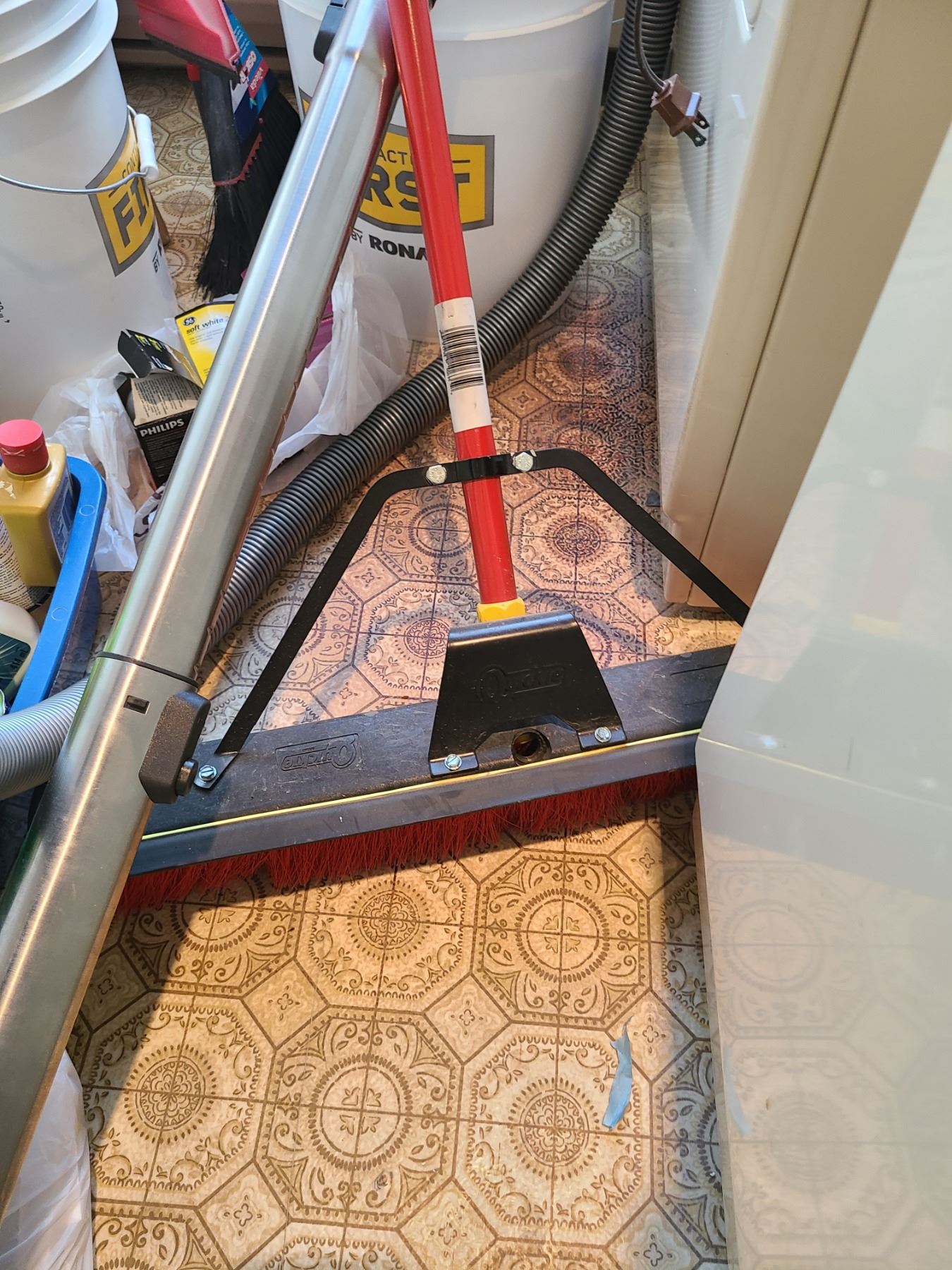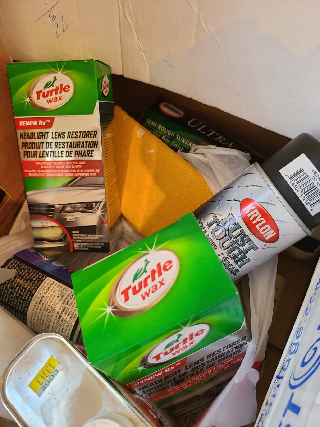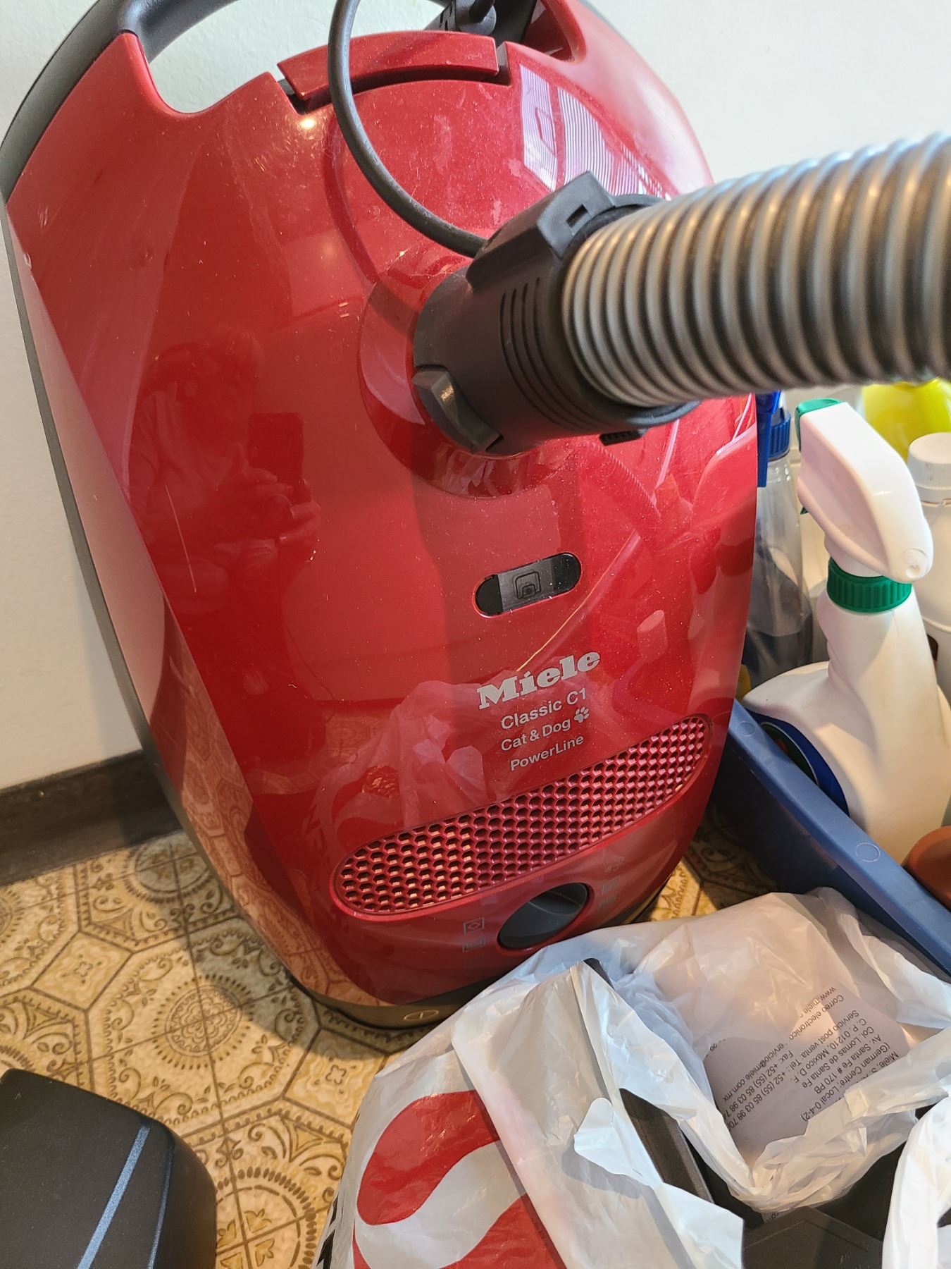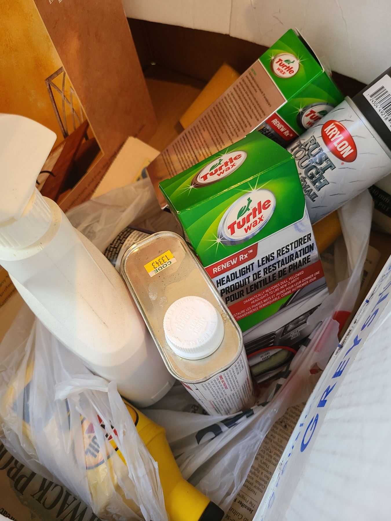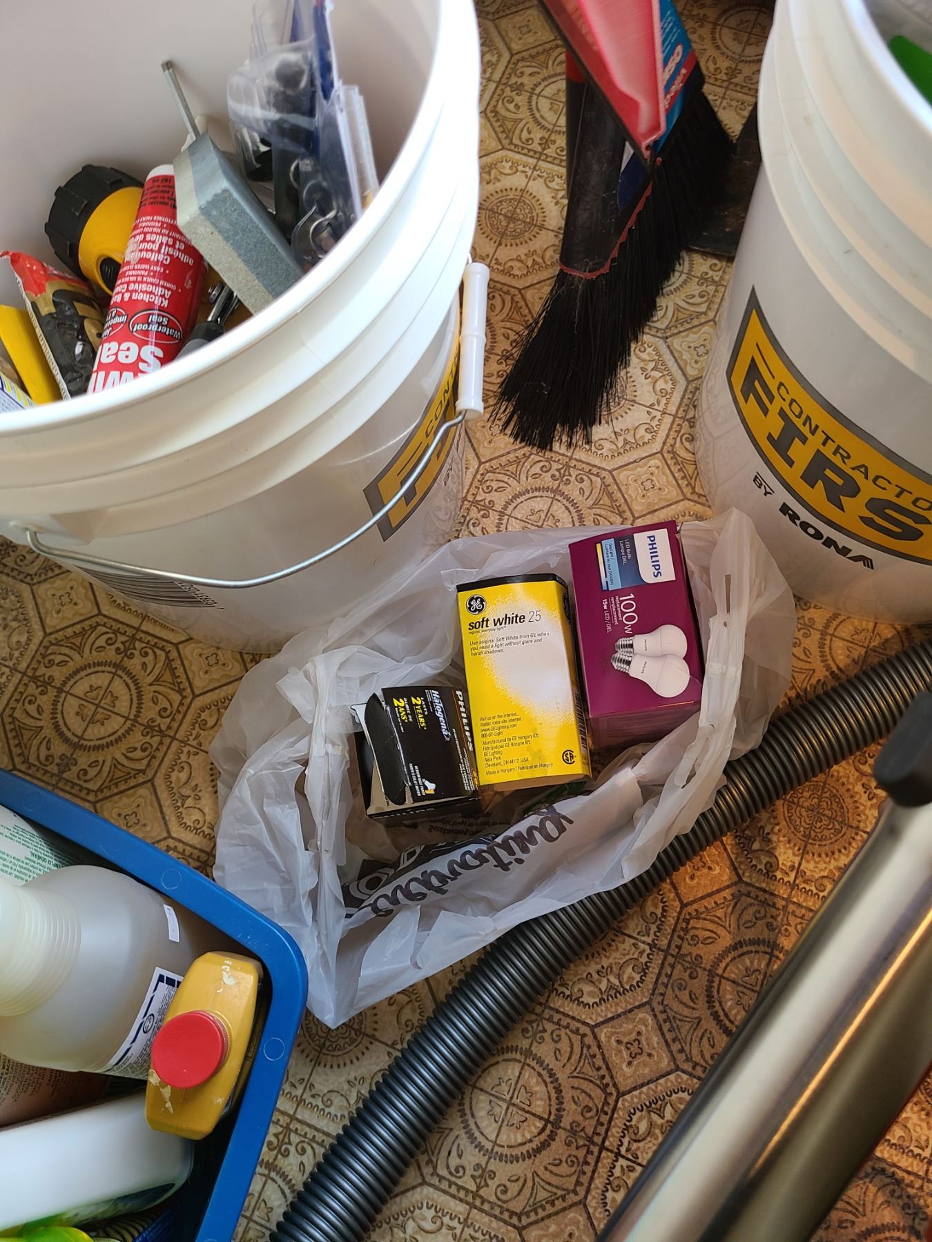 Lot includes Miele vacuum, brooms, cleaning material, paint items, and wool roller kit. Bring boxes. Pickup at 10 am.