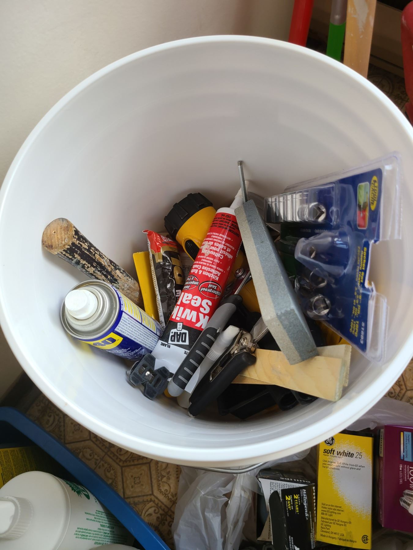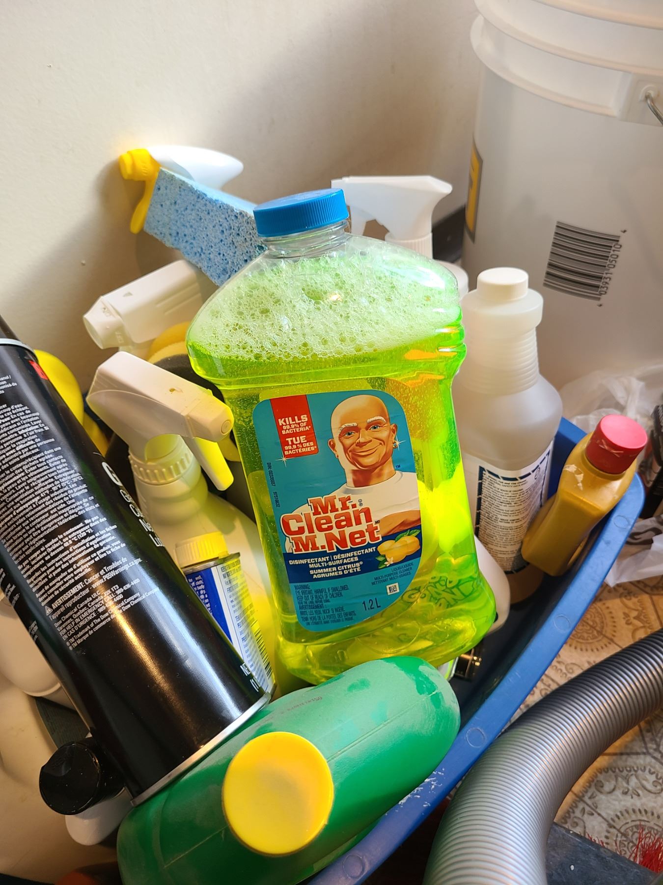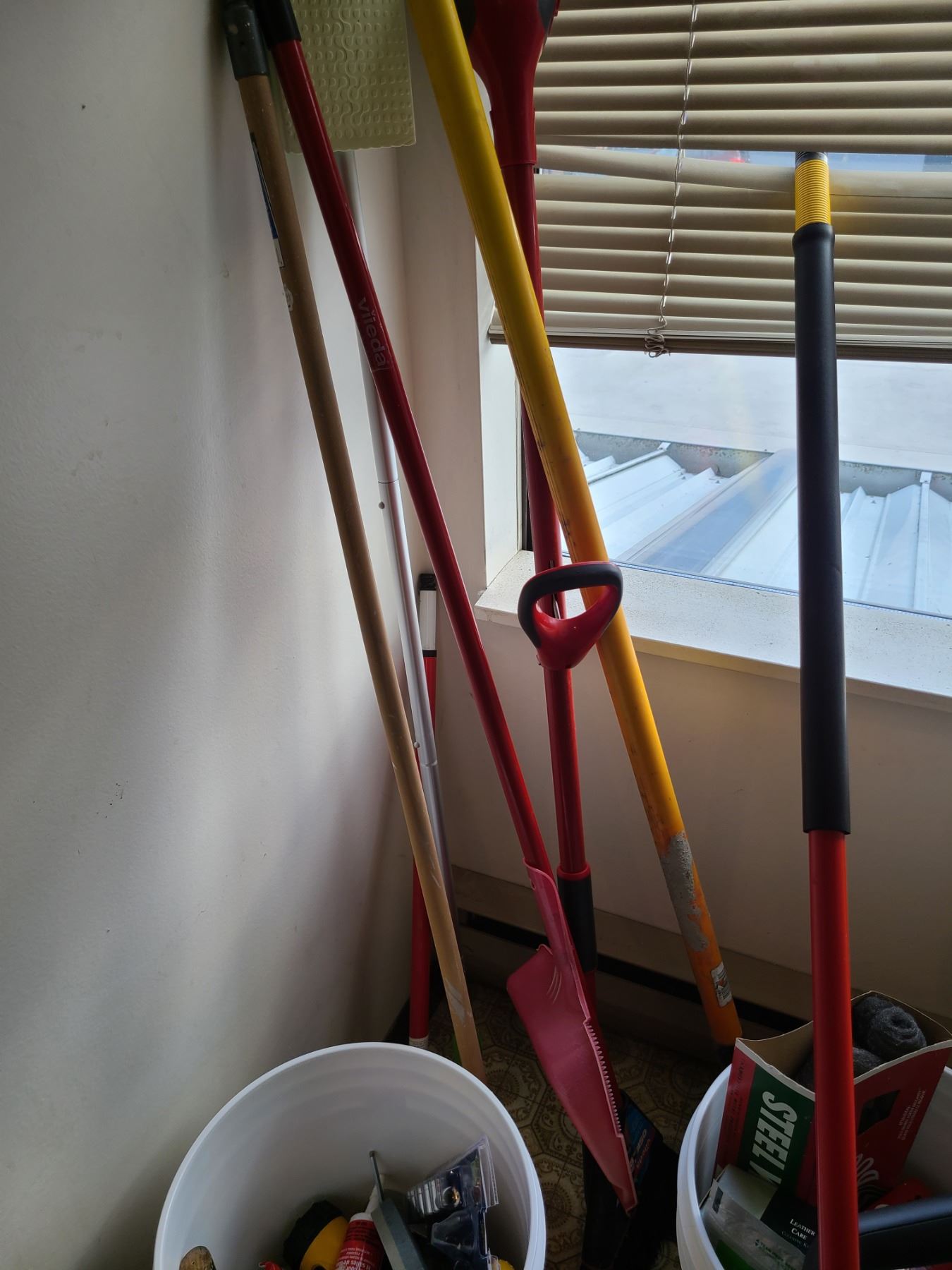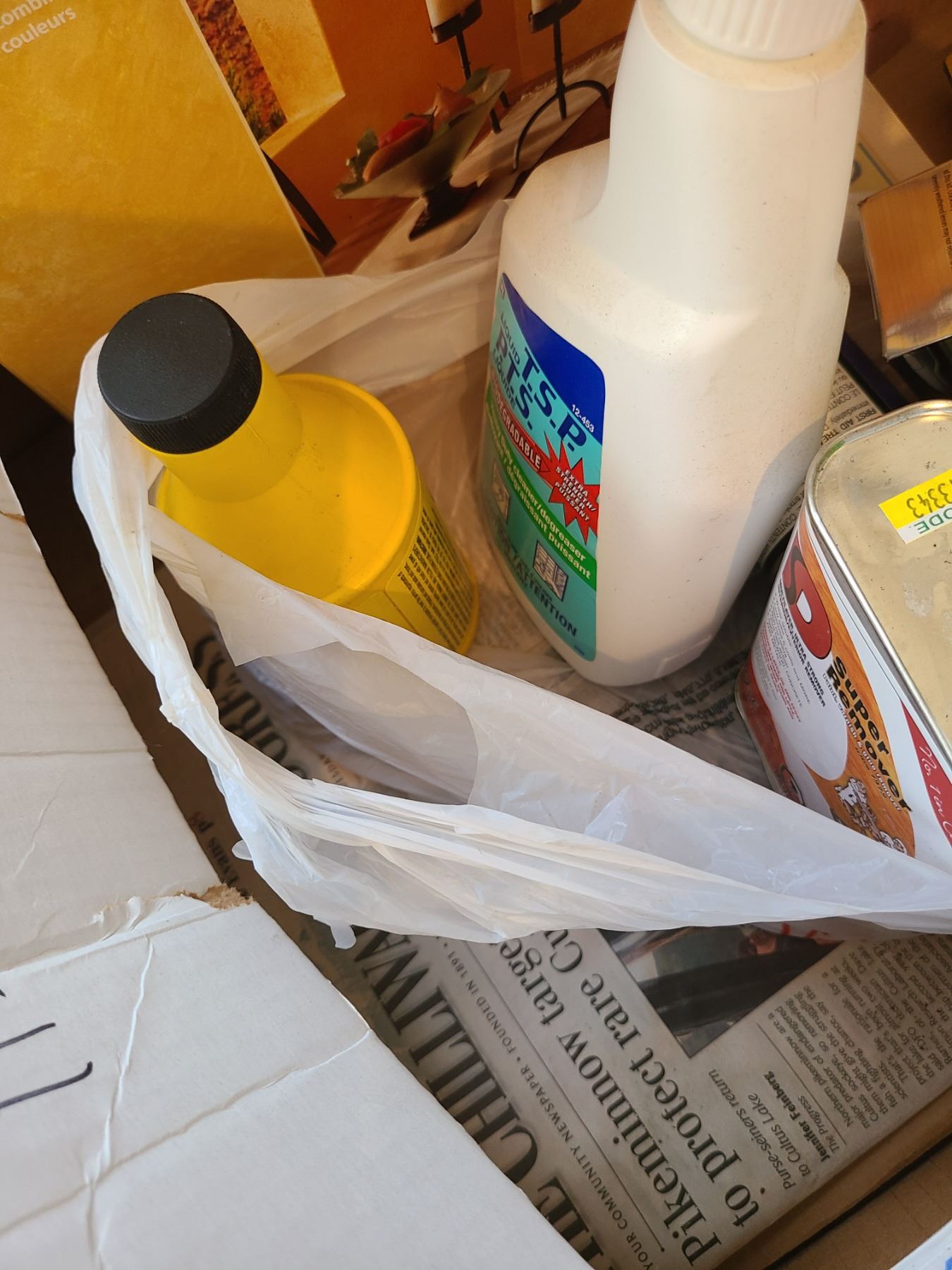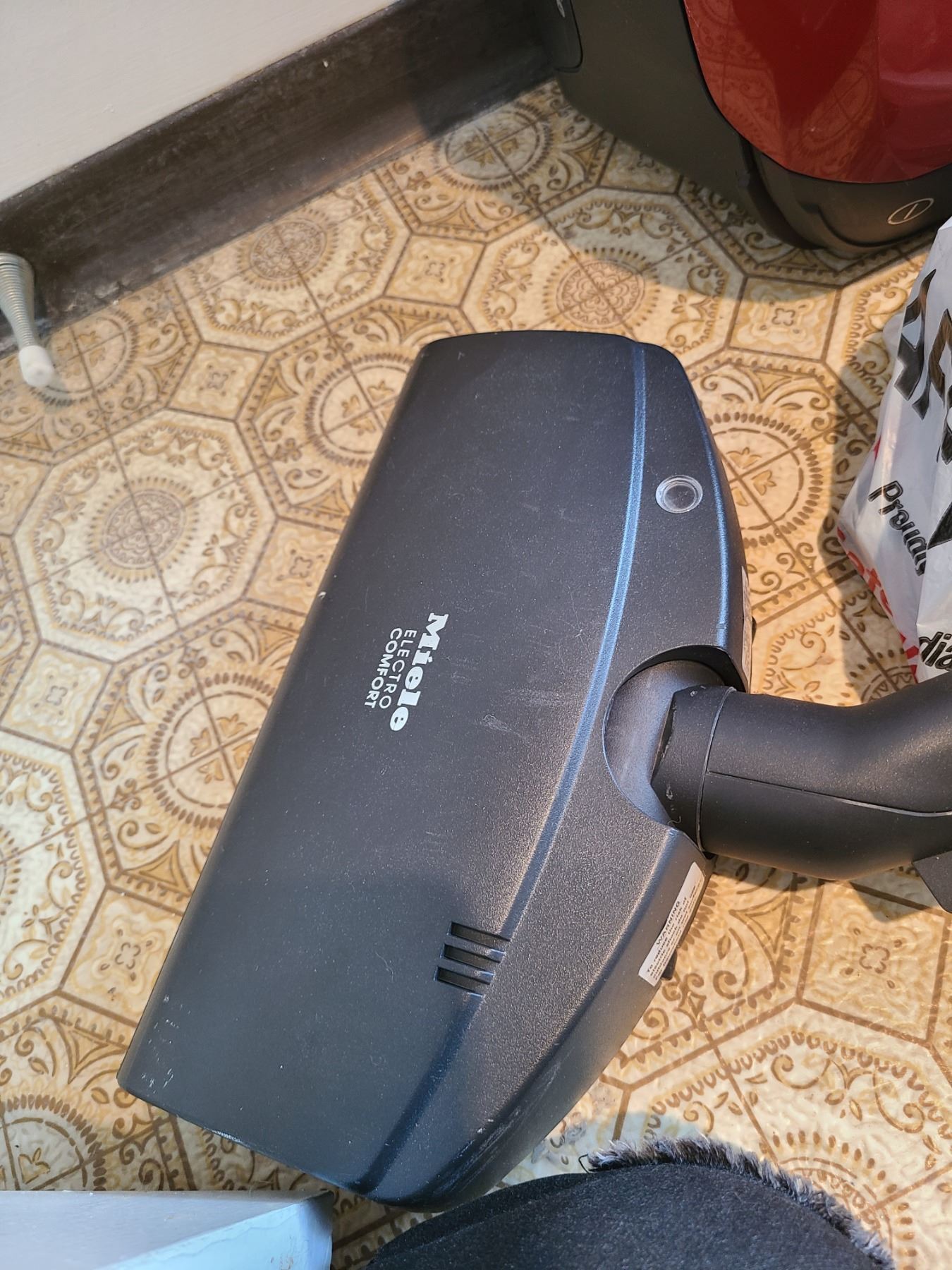 Lot includes Miele vacuum, brooms, cleaning material, paint items, and wool roller kit. Bring boxes. Pickup at 10 am.