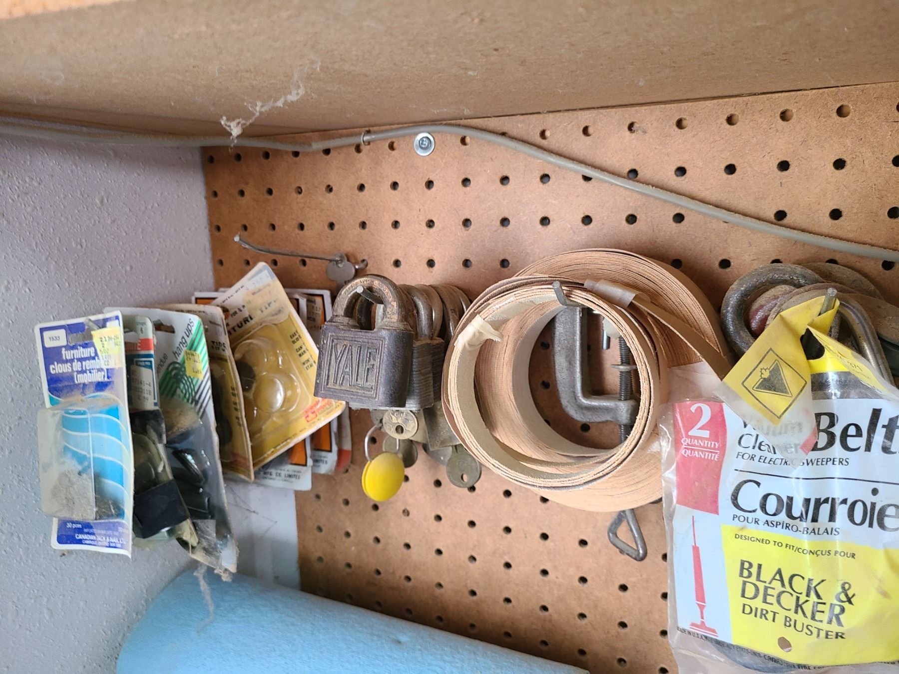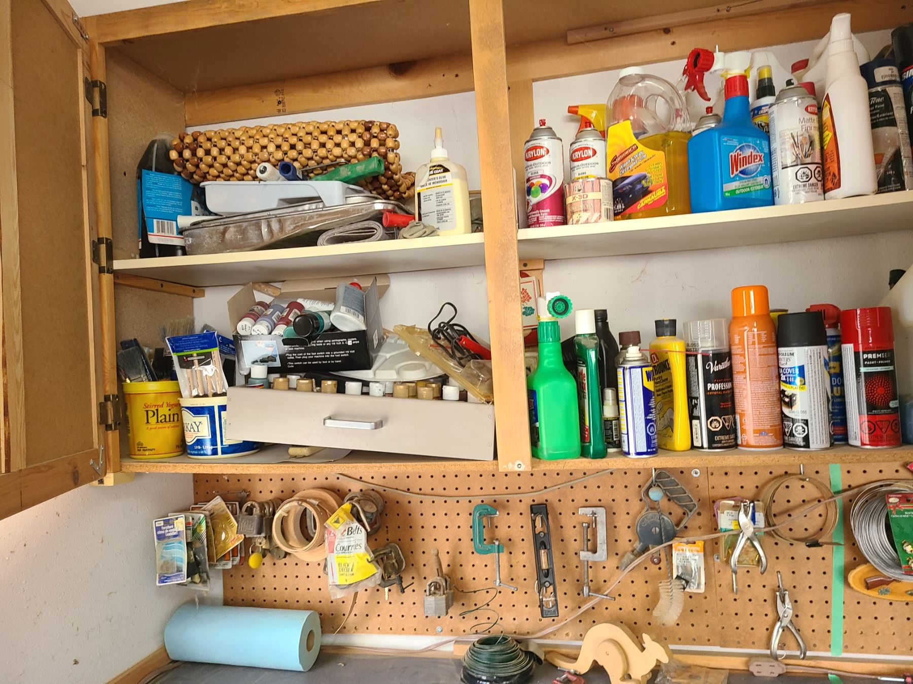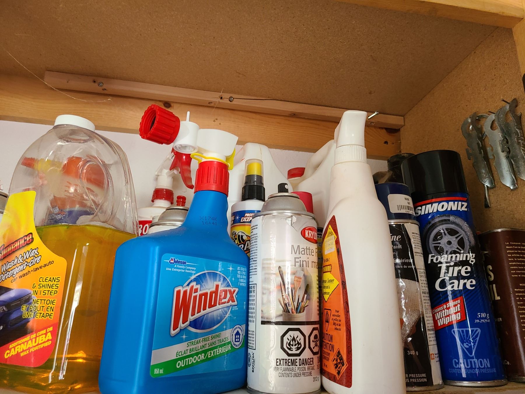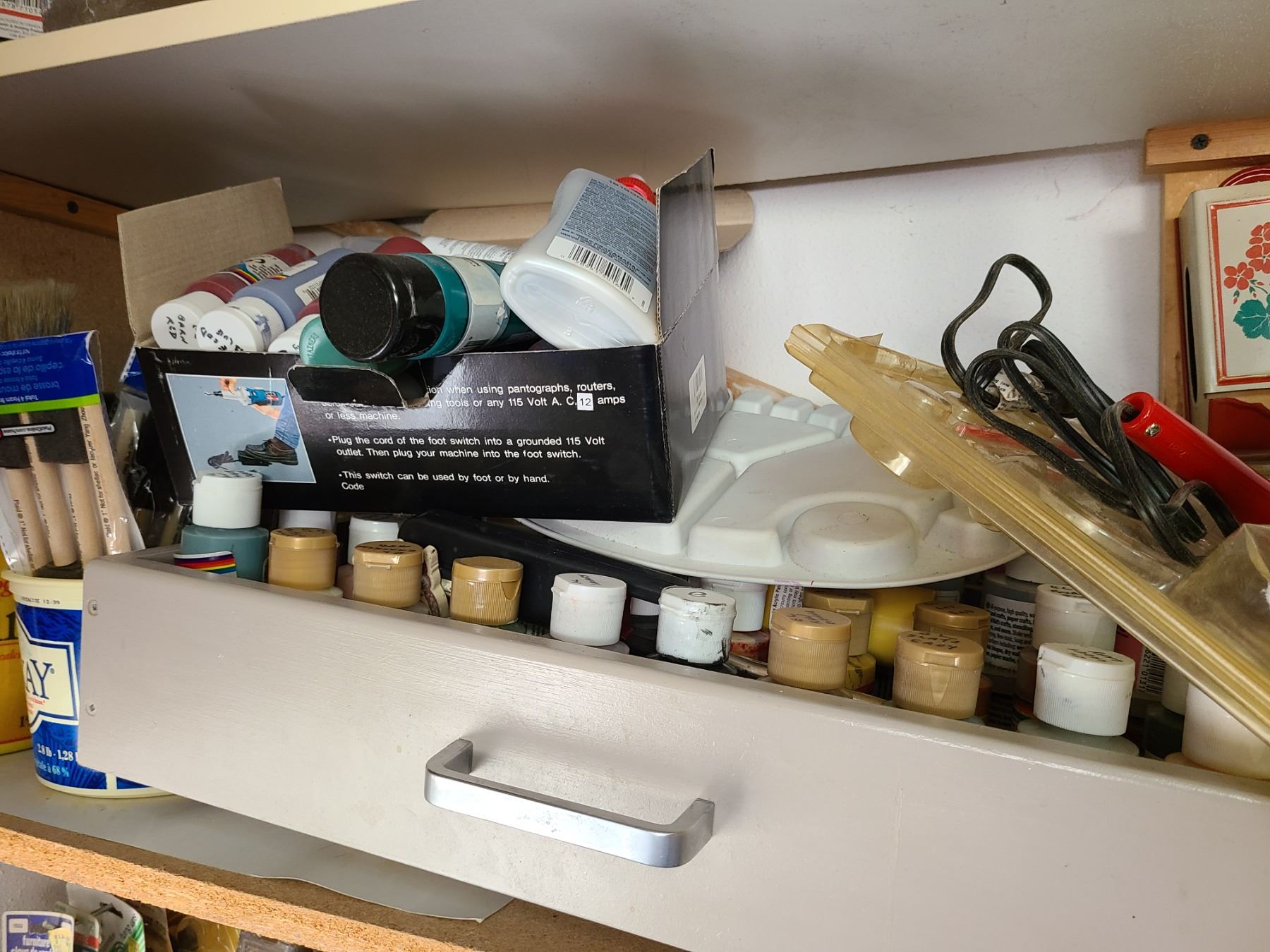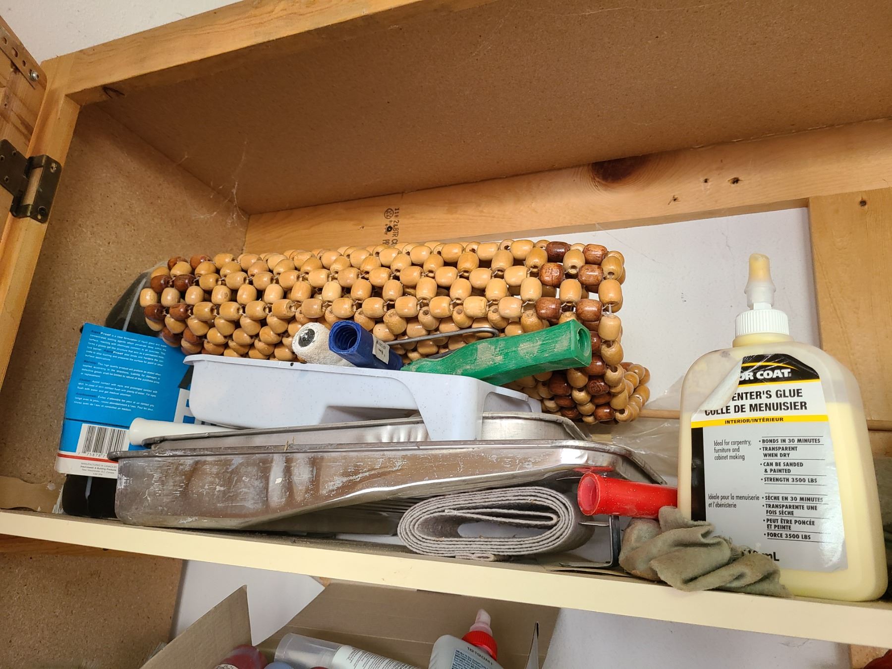 Lot includes cleaning liquids, painting jars, assortment of small parts on counter. Bring boxes. Pickup 9 am.