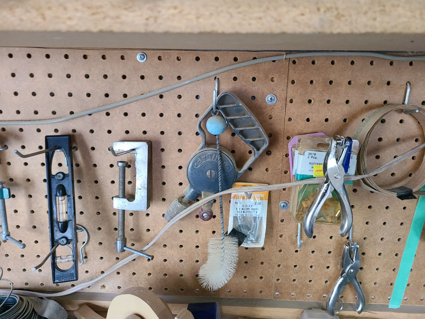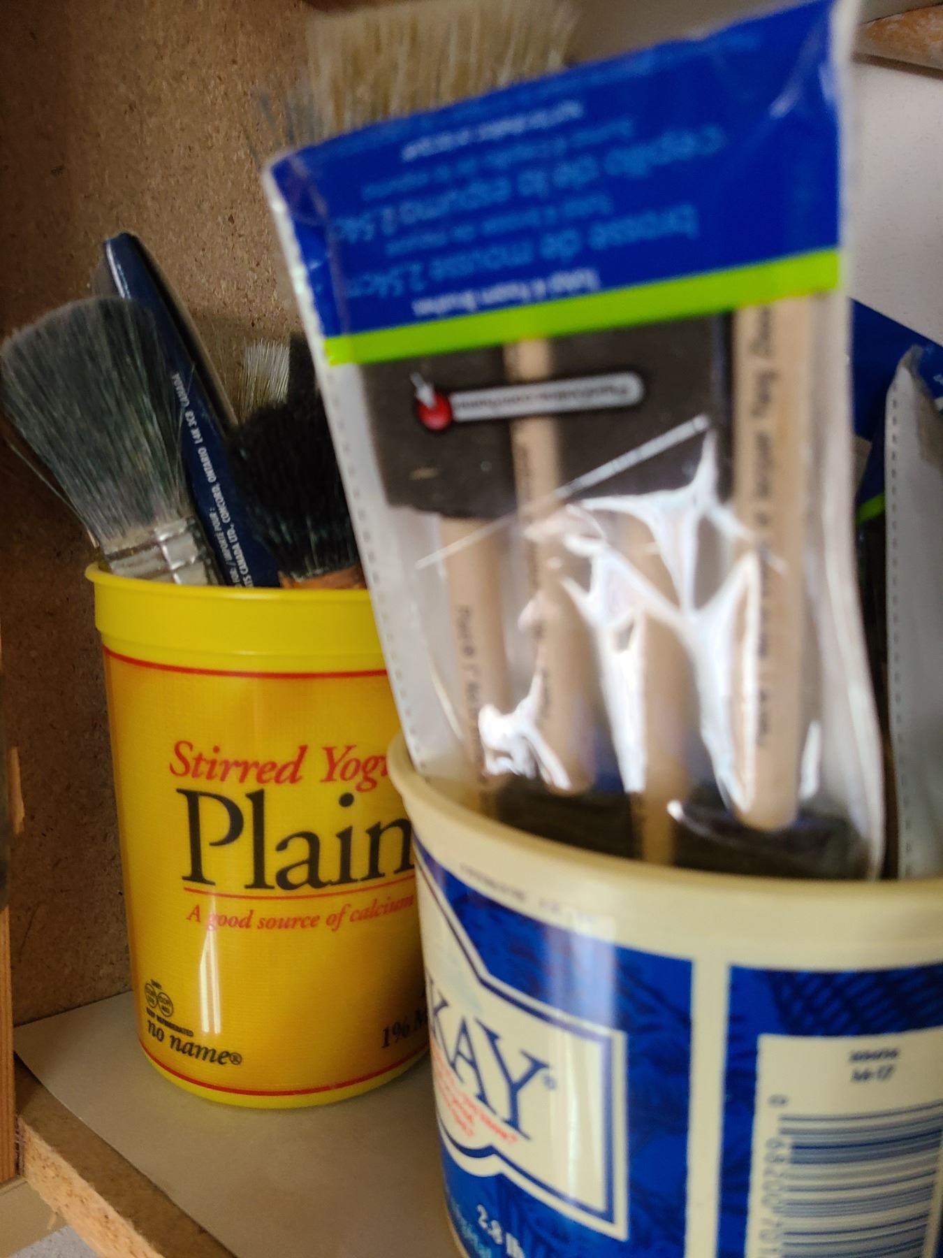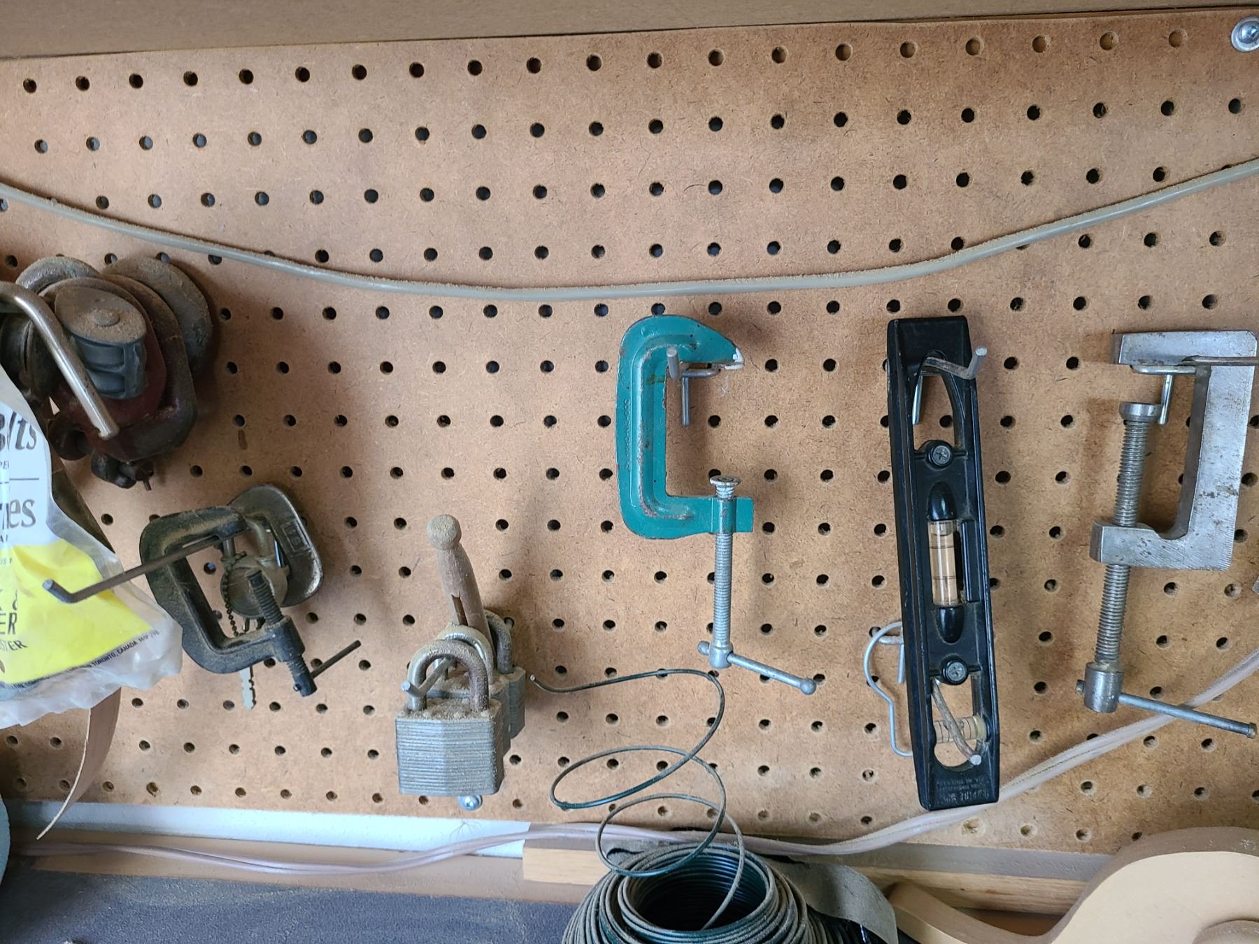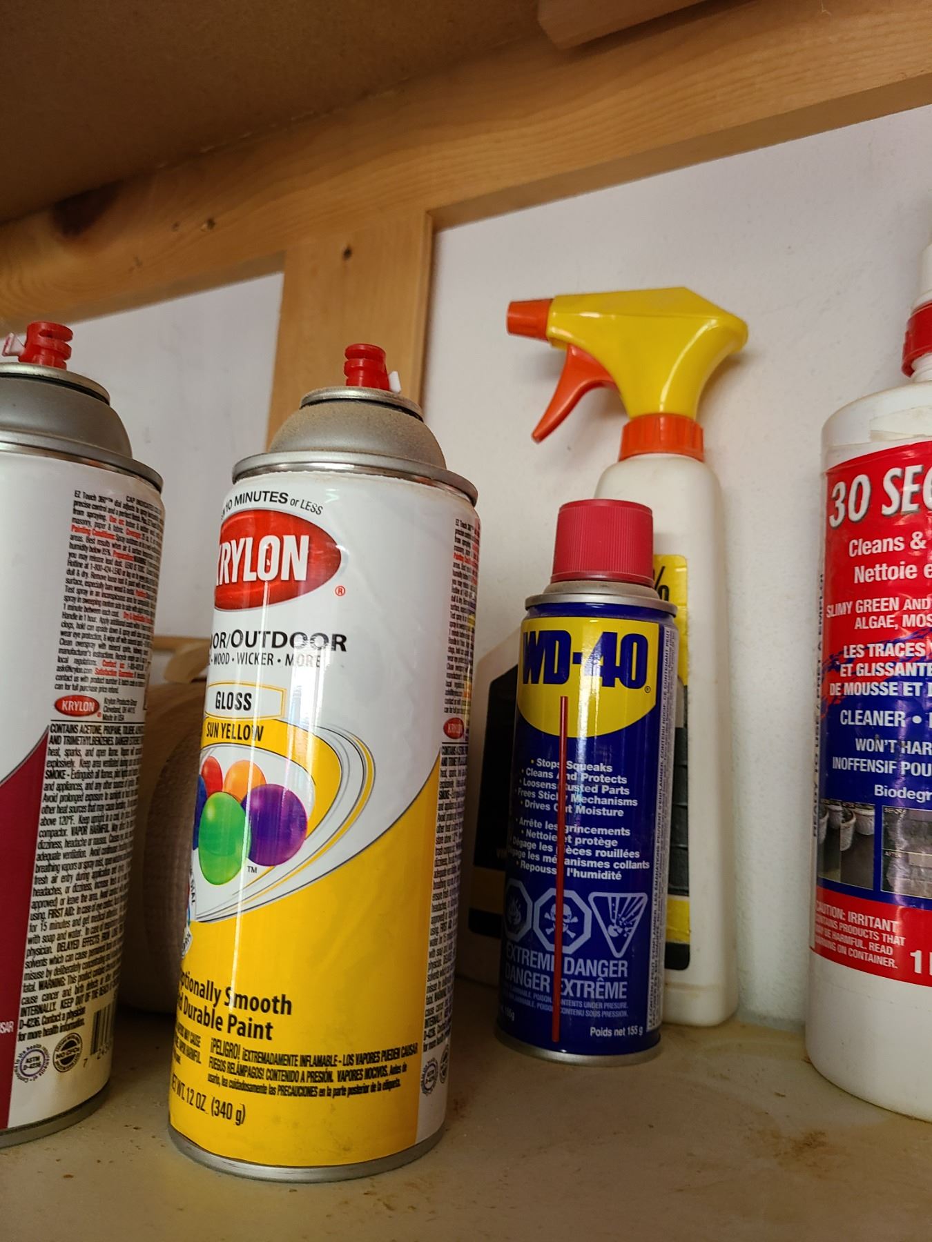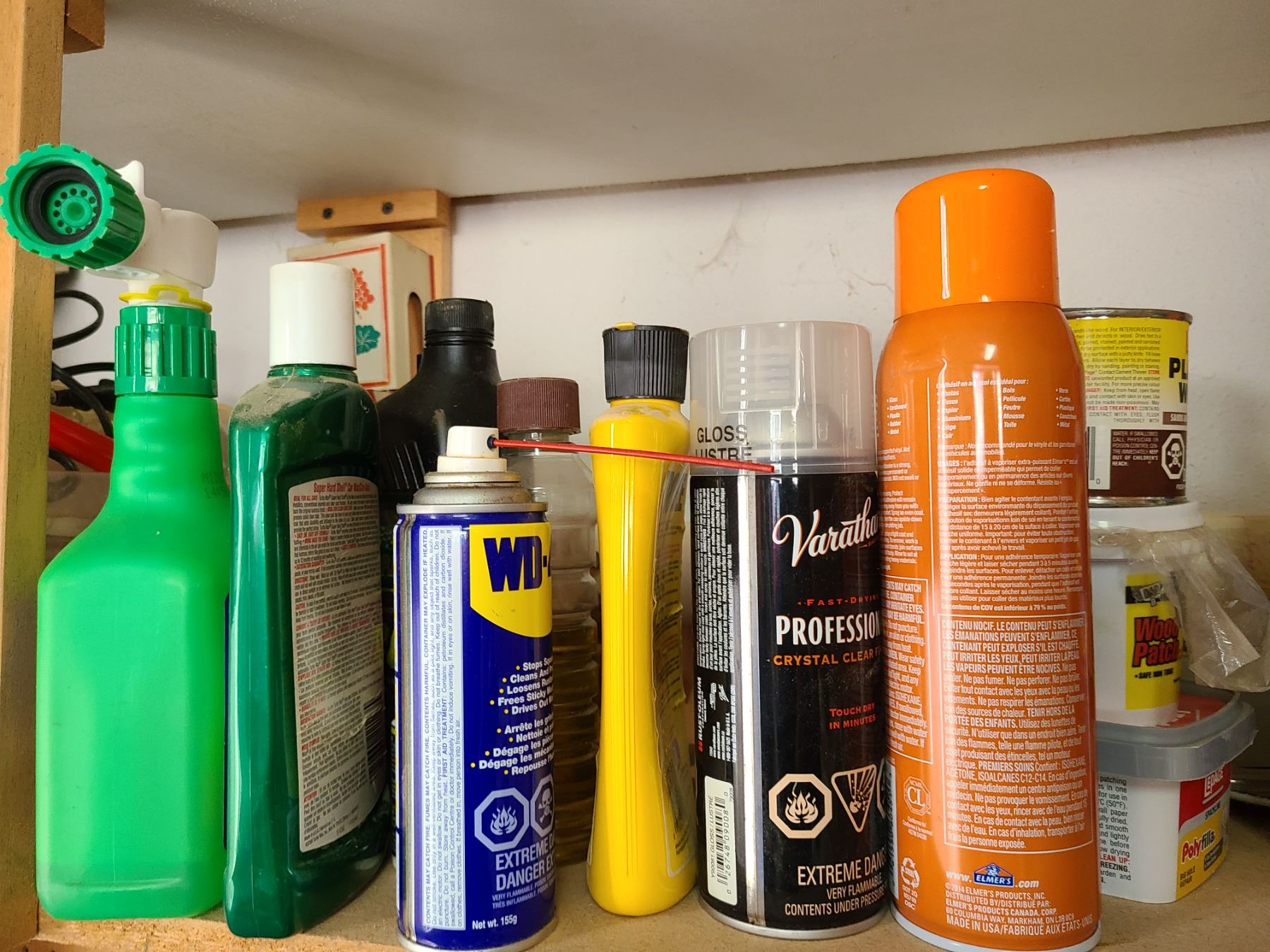 Lot includes cleaning liquids, painting jars, assortment of small parts on counter. Bring boxes. Pickup 9 am.