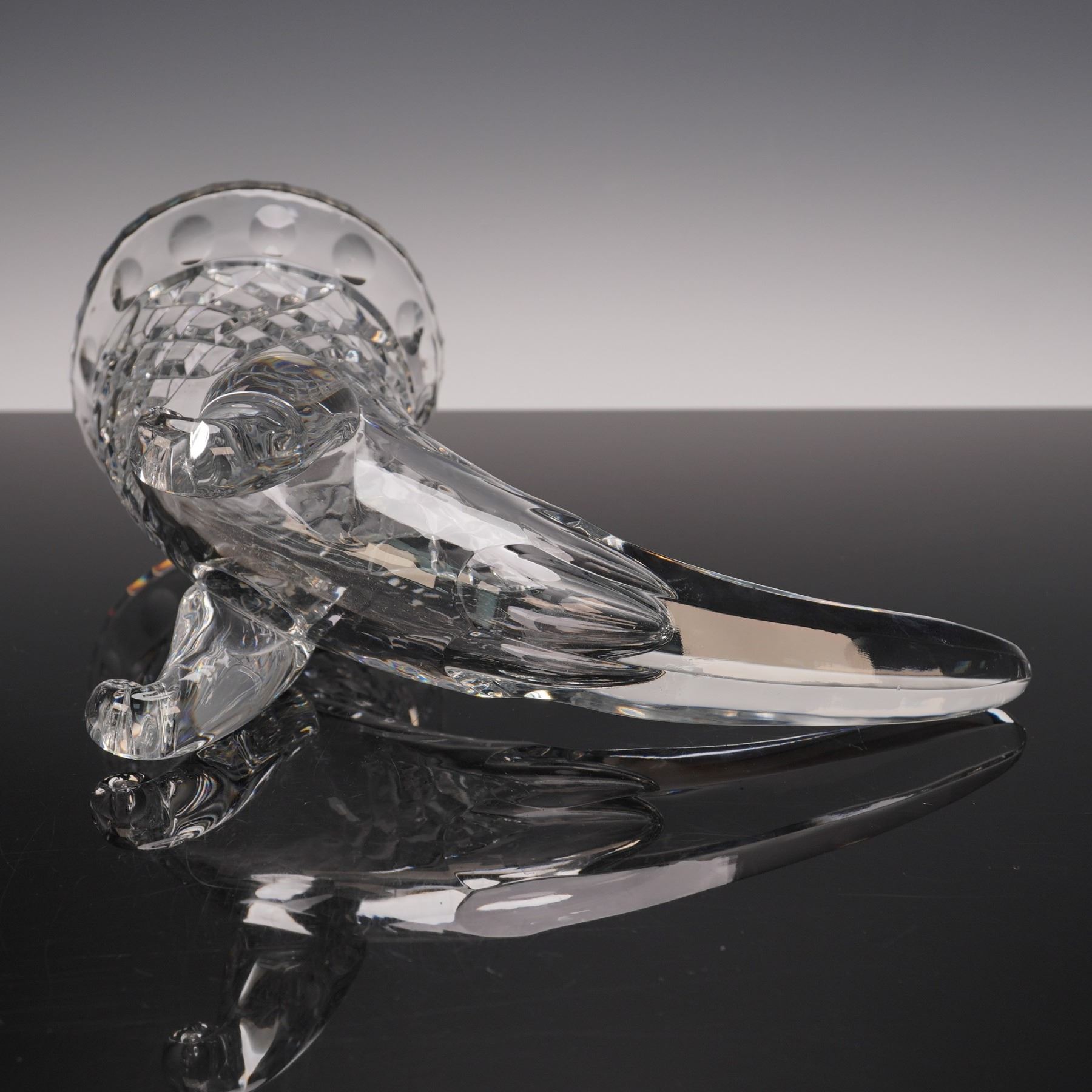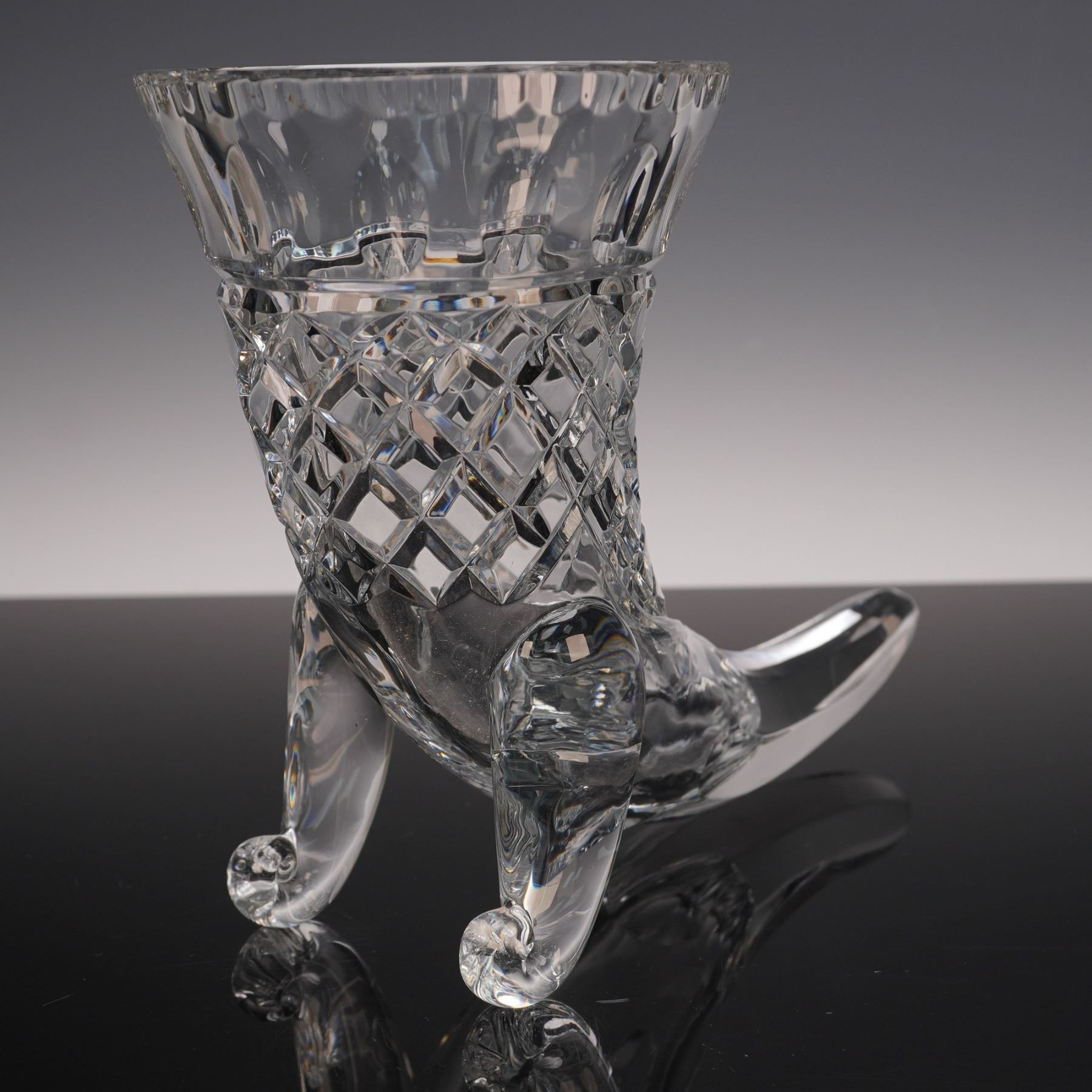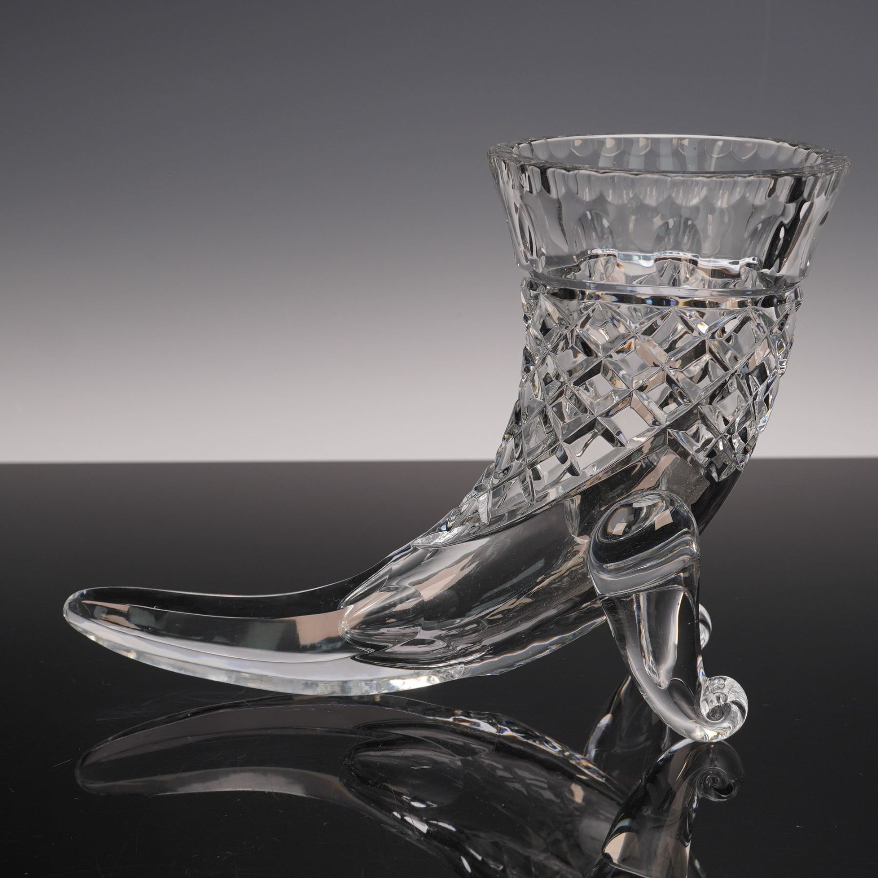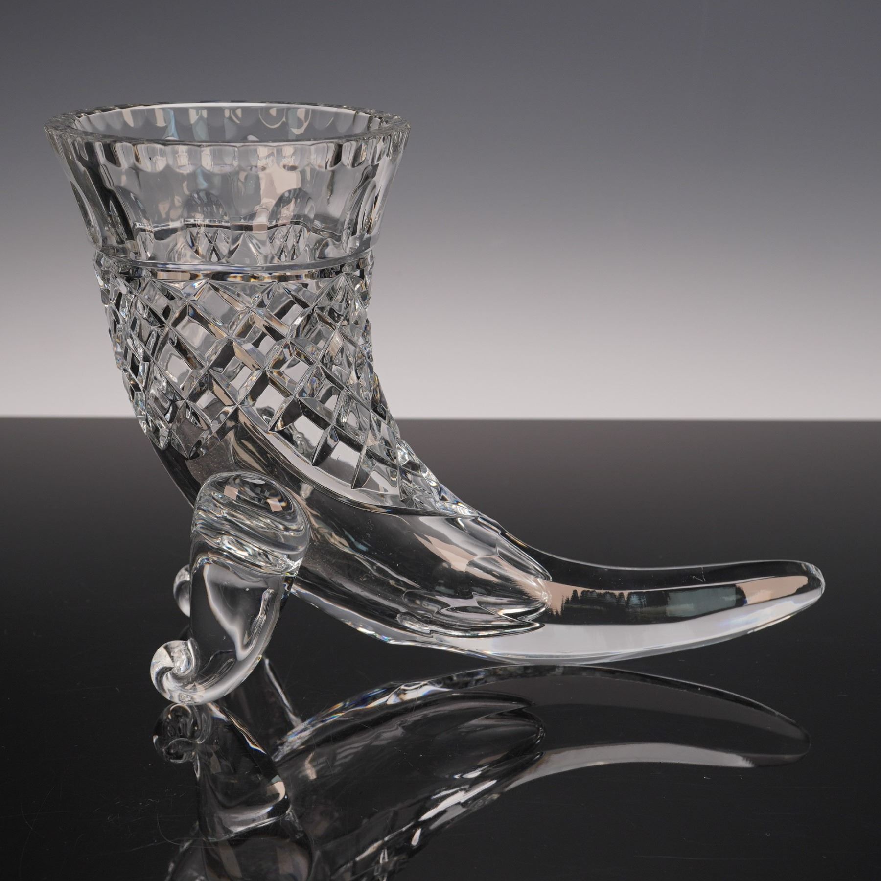 A finely crafted cut crystal cornucopia vase, featuring a flared rim with a scalloped edge, a diamond-cut lattice pattern to the body, and an elegantly curved horn form terminating in a smooth, tapered point. The piece is supported by two scrolled clear crystal legs, providing both stability and decorative appeal. The intricate cutting catches and reflects light beautifully, showcasing quality craftsmanship.