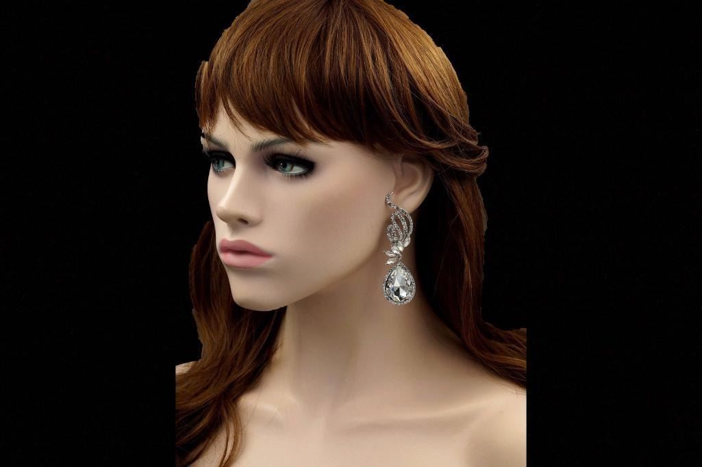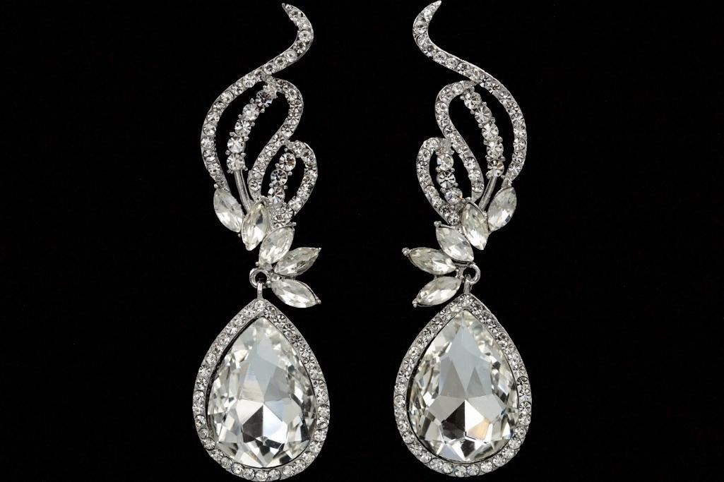 Clear Czech crystal teardrop focal stones, embellished with round & marquise shaped crystals, set into rhodium plated dangle earrings. 3"L. T9789-031018-EB-21229