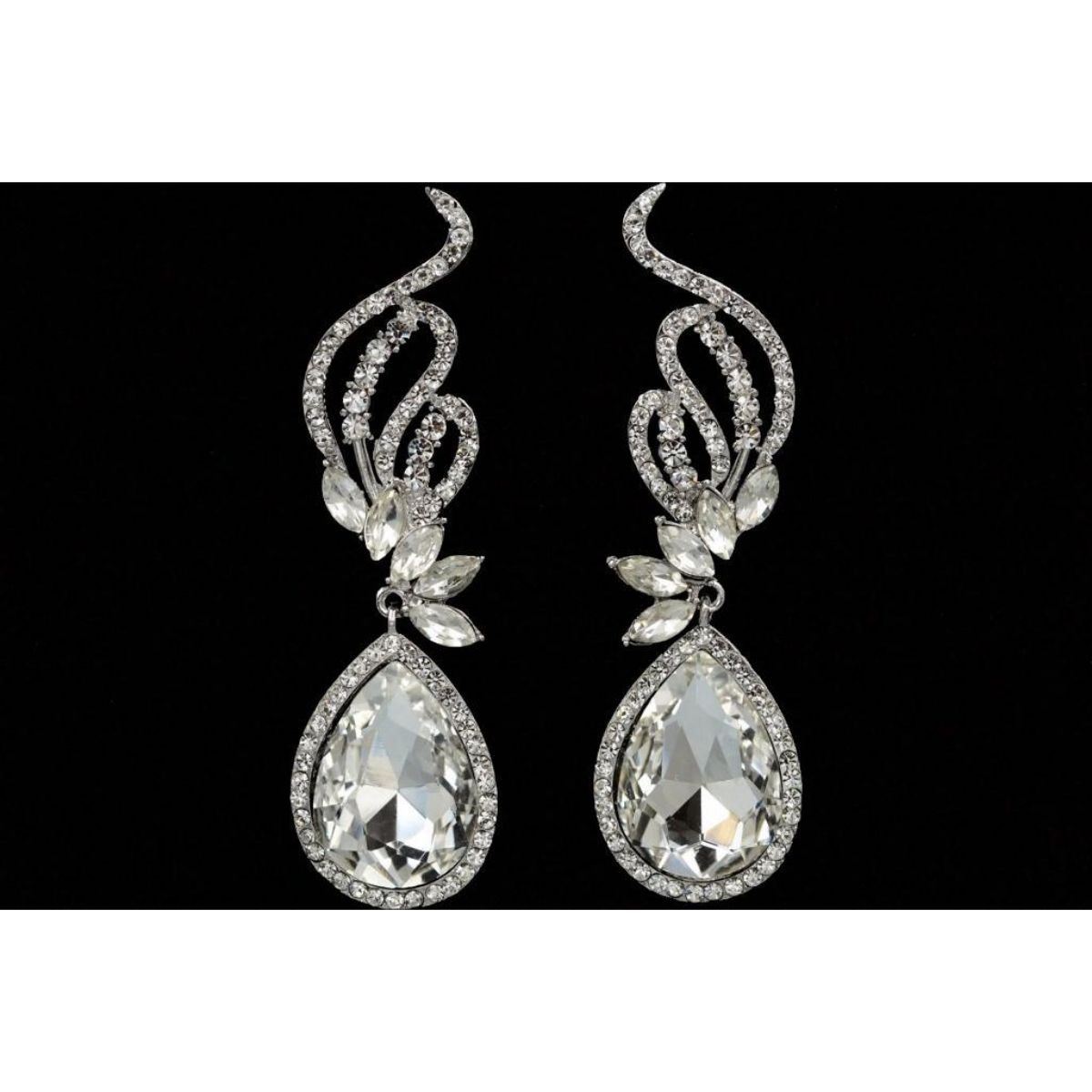 Large Czech crystal teardrop focal stones, embellished with round & marquise-shaped crystals, set into rhodium-plated dangle earrings. 3"L. T9789-031018-EB-21229