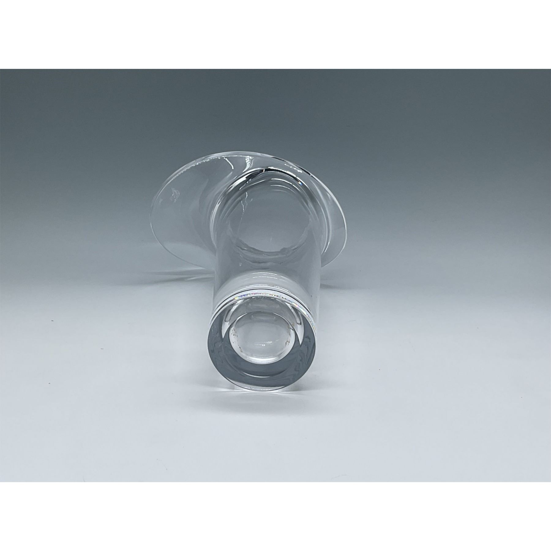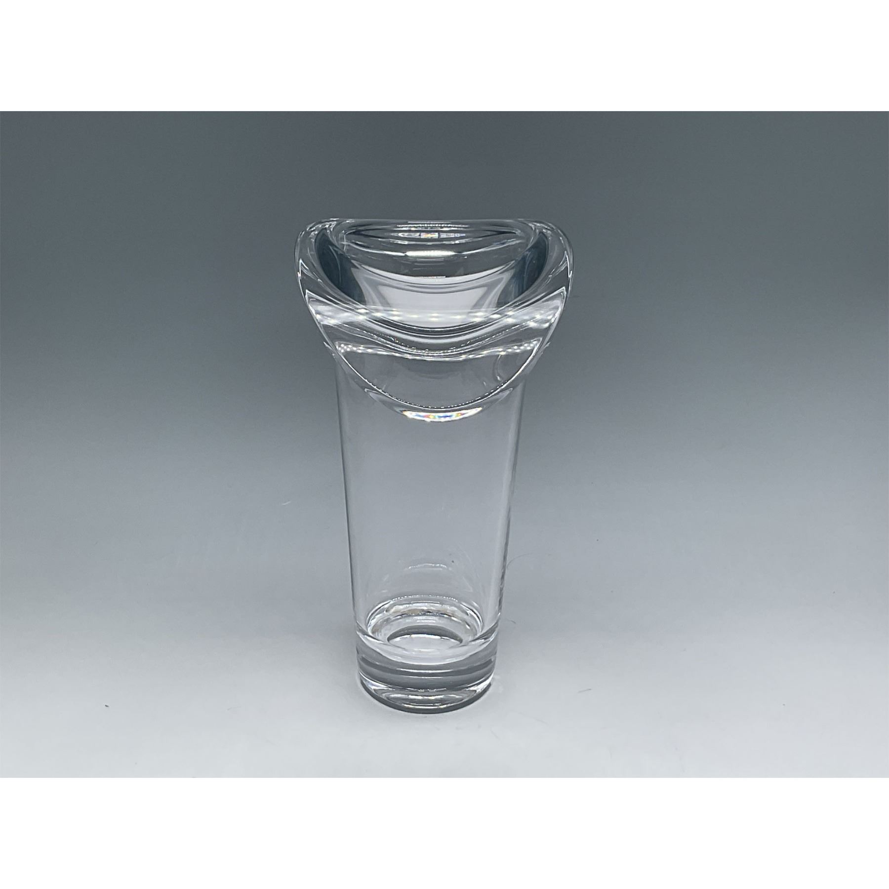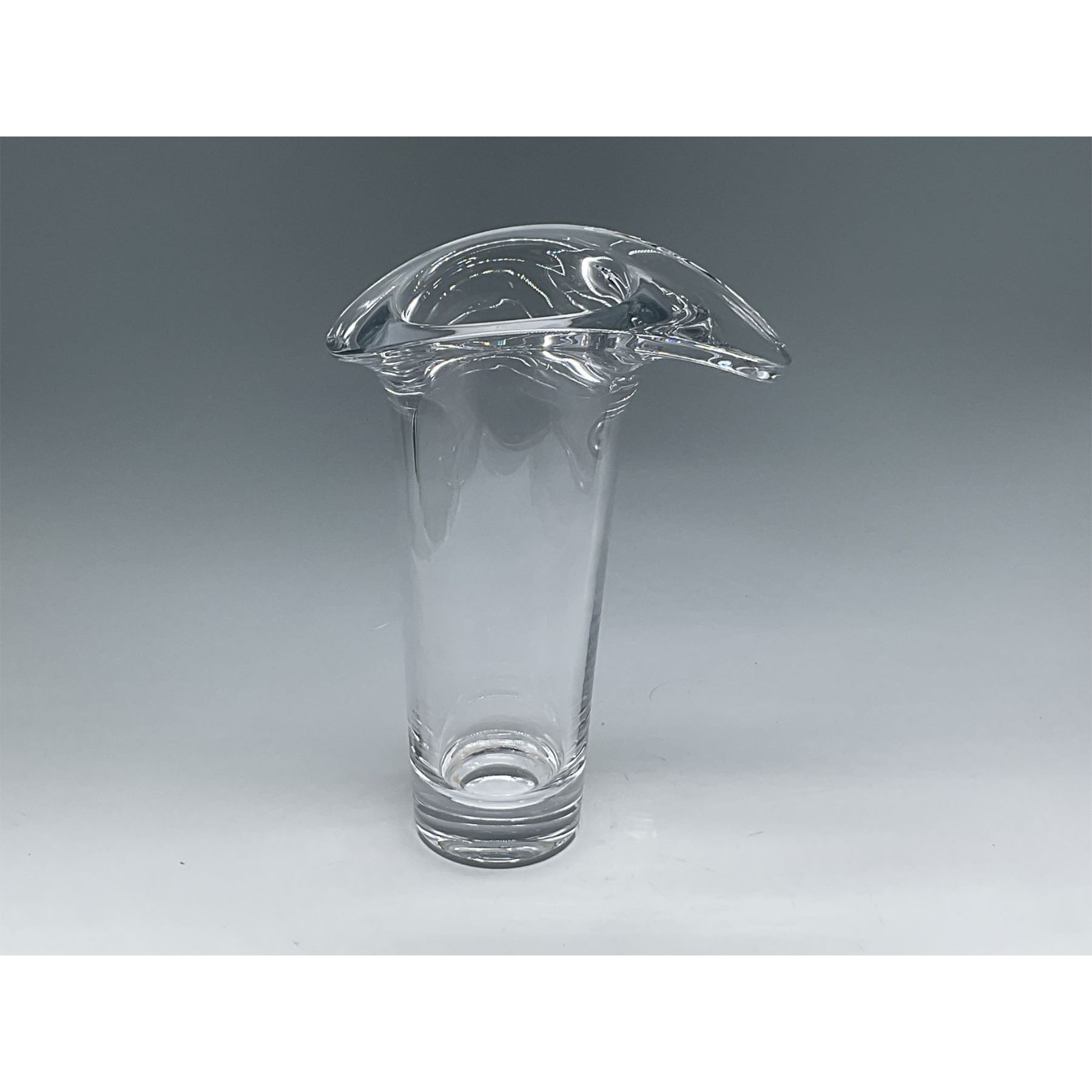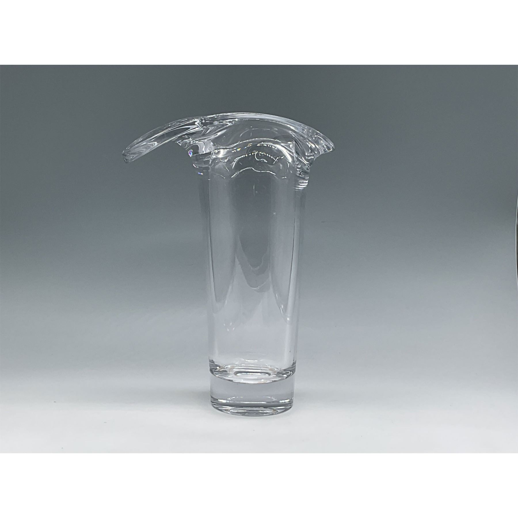 Elegant clear glass vase with an artfully designed, slightly flared and curved rim, adding a touch of modern sophistication. Standing at 10"H, this versatile vase is ideal for displaying floral arrangements or as a standalone decorative piece. The minimalist design ensures it complements various interior styles, from contemporary to classic. In excellent condition with no visible chips or cracks. A timeless addition to your glassware collection.