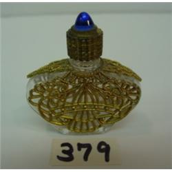 2 1/16" tall & 5" at base. Perfume bottle w/blue glass jewel in screw on lid, clad in filigree brass casing on clear impressed glass. Good condition.