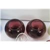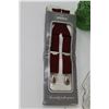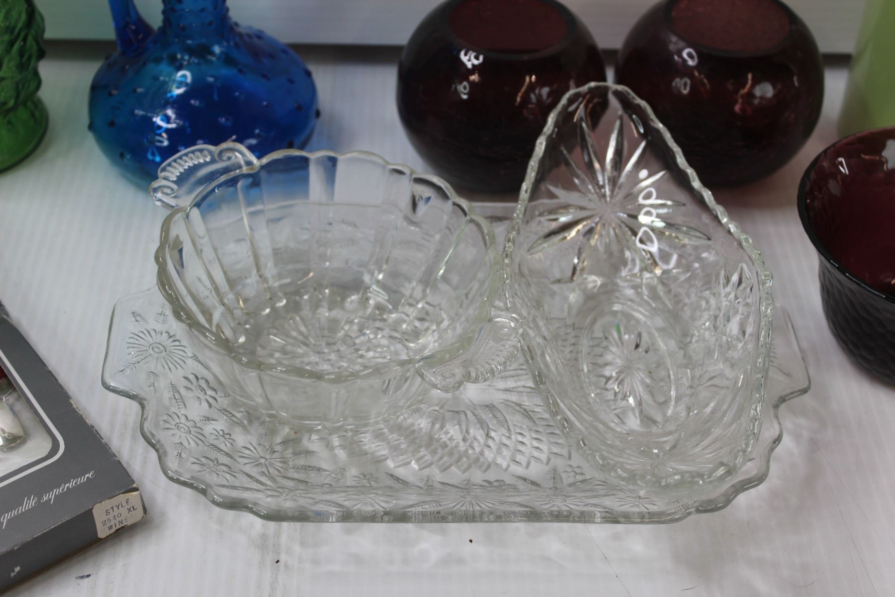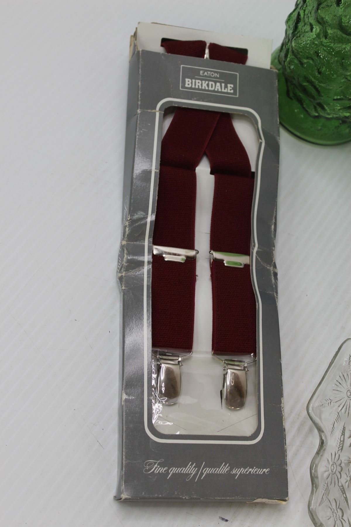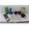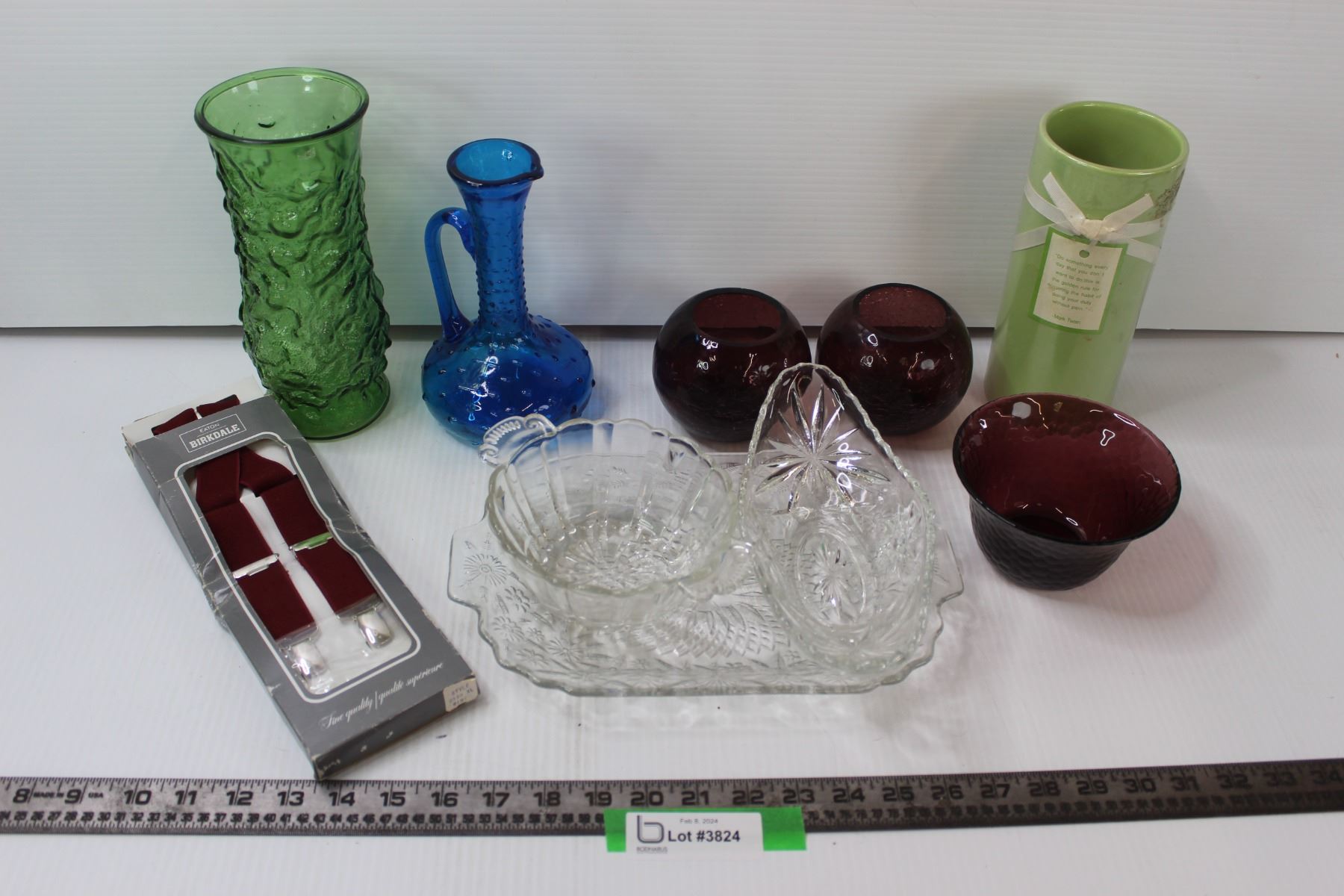 Clear Glass Serving Tray Set, (2) Colored Glass Vases, Green Ceramic Vase, (3) Red Glass Tealight Holders, Red Suspenders