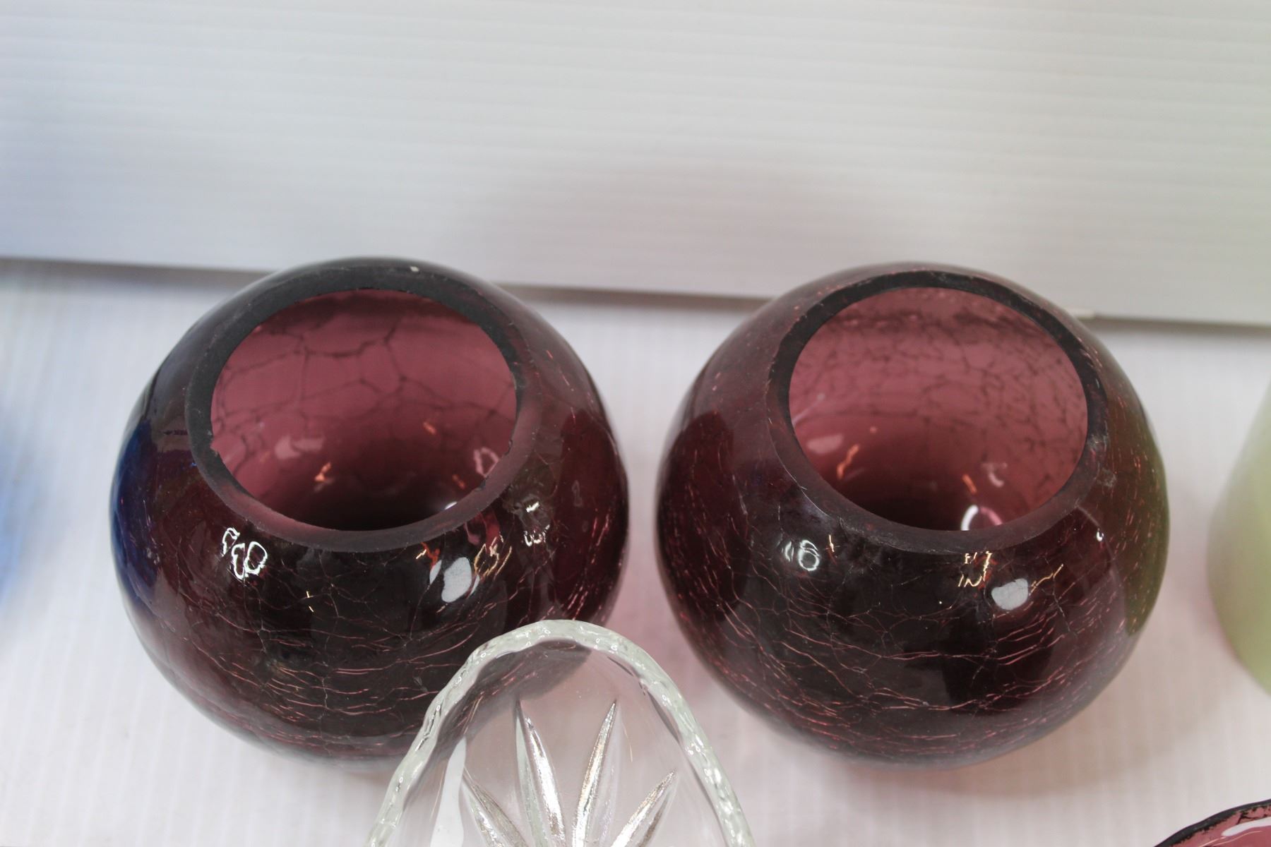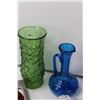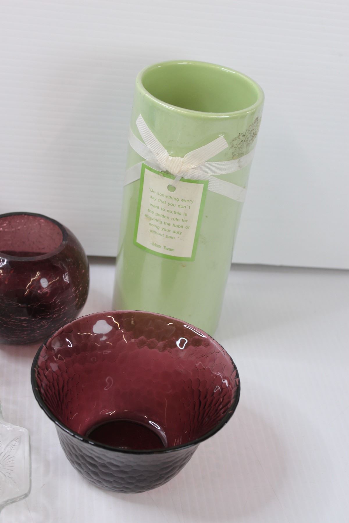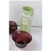 Clear Glass Serving Tray Set, (2) Colored Glass Vases, Green Ceramic Vase, (3) Red Glass Tealight Ho