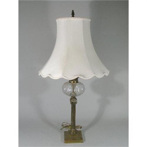 Hinks Table Lamp - Beautiful clear cut glass font supported by fluted brass Corithian column. Stepped base, burner knob marked "Hink's NO 2 Duplex" 36"h