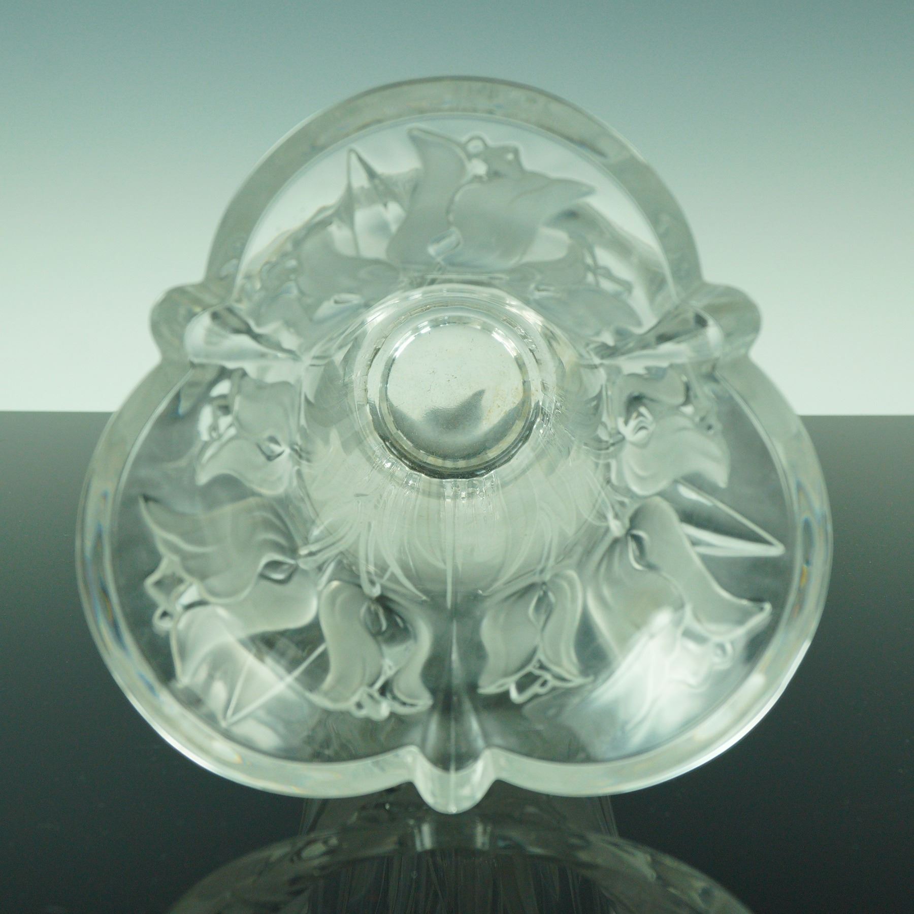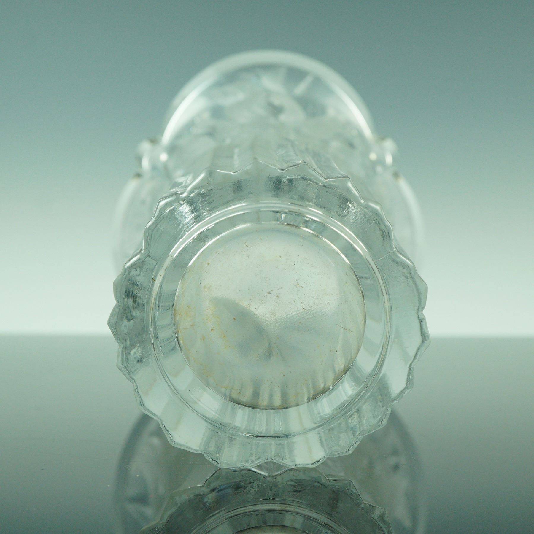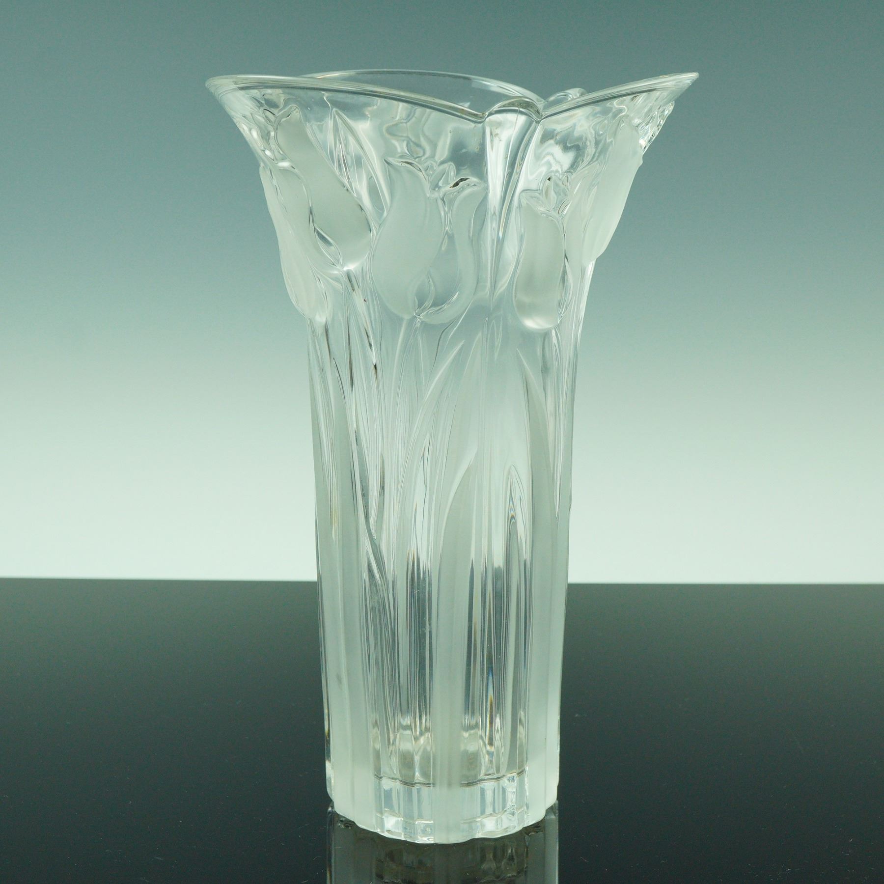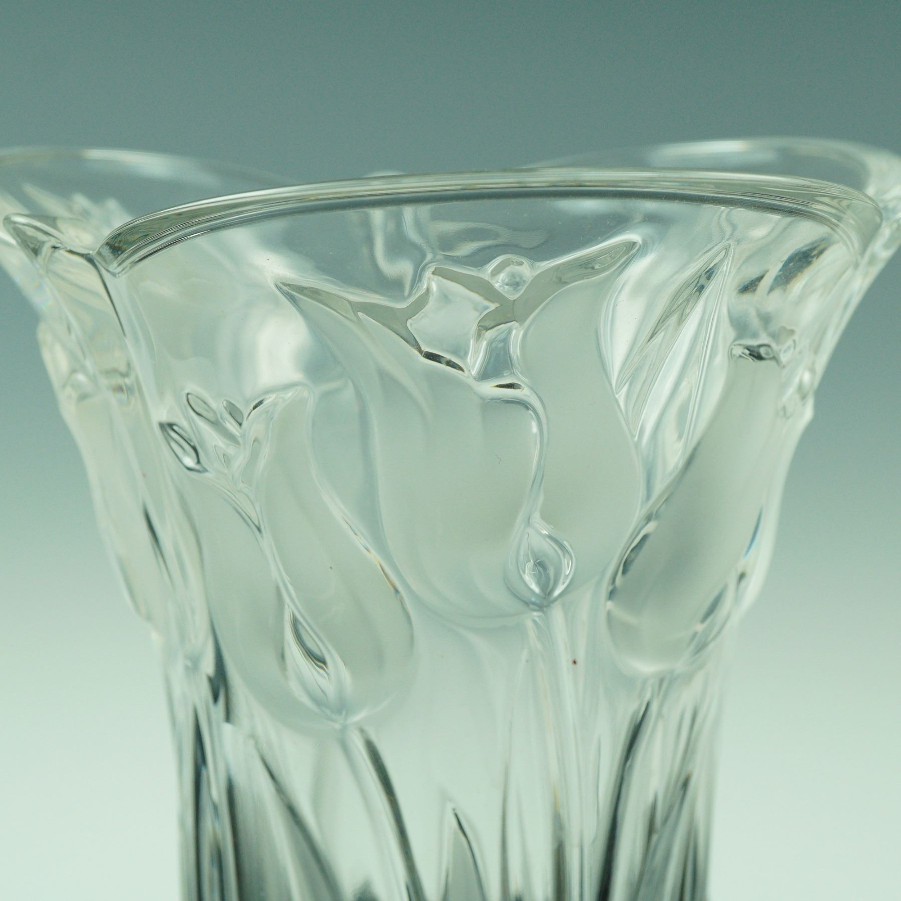 A striking vase featuring an elegant tulip motif in high relief, beautifully blending frosted and clear finishes for a dynamic play of light and texture. The design captures the grace of tulip blossoms in full bloom, their forms rising from the base and wrapping around the body with fluid artistry. The scalloped, flared rim enhances its sculptural presence, making it equally suitable as a centerpiece or display piece. The vase rests on a polished base, showcasing both craftsmanship and timeless style. A wonderful statement piece that celebrates the artistry of glassmaking and the enduring beauty of the tulip.
