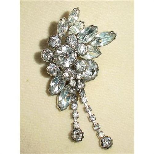 The fashion accent of choice. Hand set Rhinestones. Clear, brilliant fire, set in silver. An eye catching design with two dropped ?chains? of Rhinestones providing life and movement to this unique brooch.