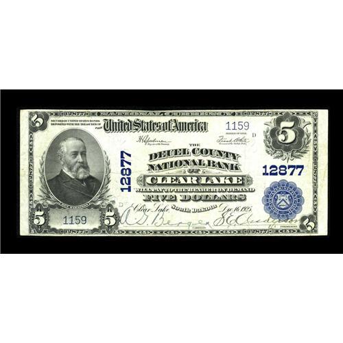 <B>Clear Lake, SD</B></I> - $5 1902 Plain Back Fr. 609 <B>The Deuel County NB</B></I> Ch. # 12877<BR>This bank issued the $5 denomination only in Plain Backs as well as Types 1 and 2. With the discovery of this bright <B>Very Fine+++,</B></I> the census now grows to four in large size, with this being the nicest of the small known population by a considerable margin. The original ink signatures are at full strength. The margins are attractively ample all around and there is the crispness one would typically associate with a higher grade. A mere $180 in large remained outstanding from here as of 1935. The discovery of this nice example suggests that prayers of the faithful to St. Jude or St. Anthony may well have been answered. Any South Dakota specialist will consider this a trophy note well worth whatever it takes to acquire this exceptionally attractive rarity. Bid accordingly, as another opportunity to acquire a note with the aesthetic attractions of this item may well not arise again during the lifetimes of today's collecting fraternity.<BR><BR><b>Shipping:</b> Coin/Currency (<a target="_blank" href="http://www.heritageauctions.com/common/shipping.php">view shipping information</a>)