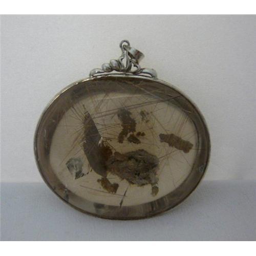 This oval shape is framed with silver pendant hook. There are mixed material inside the crystal, that creates a scenery for the piece. The needle shape material is also an important characteristic too. The crystal is a little bit of light brown color.