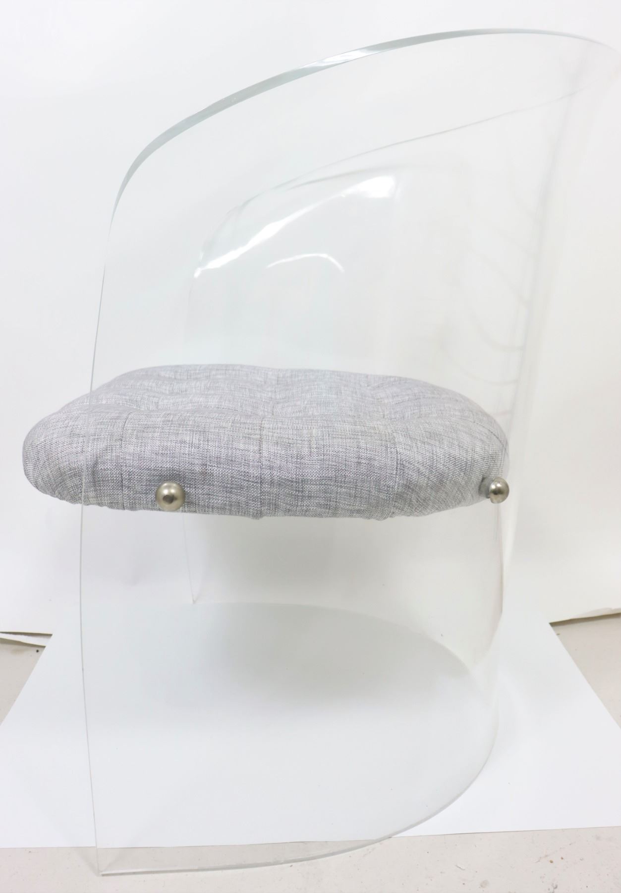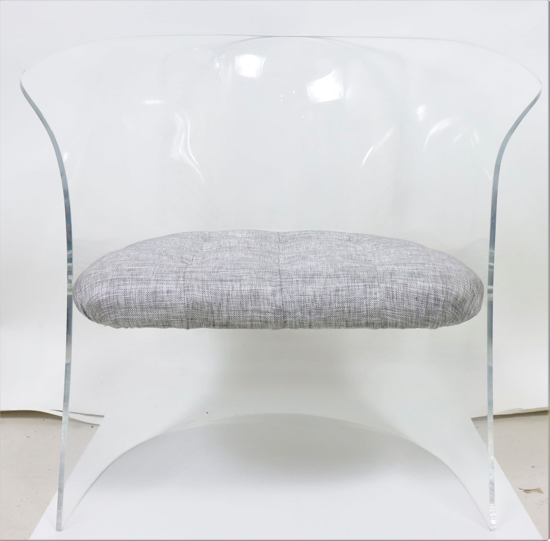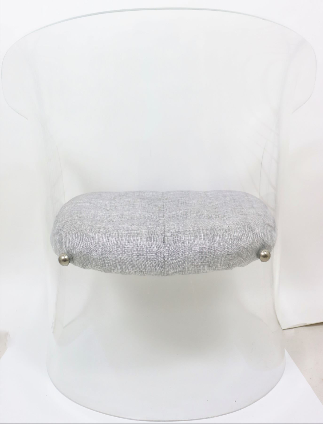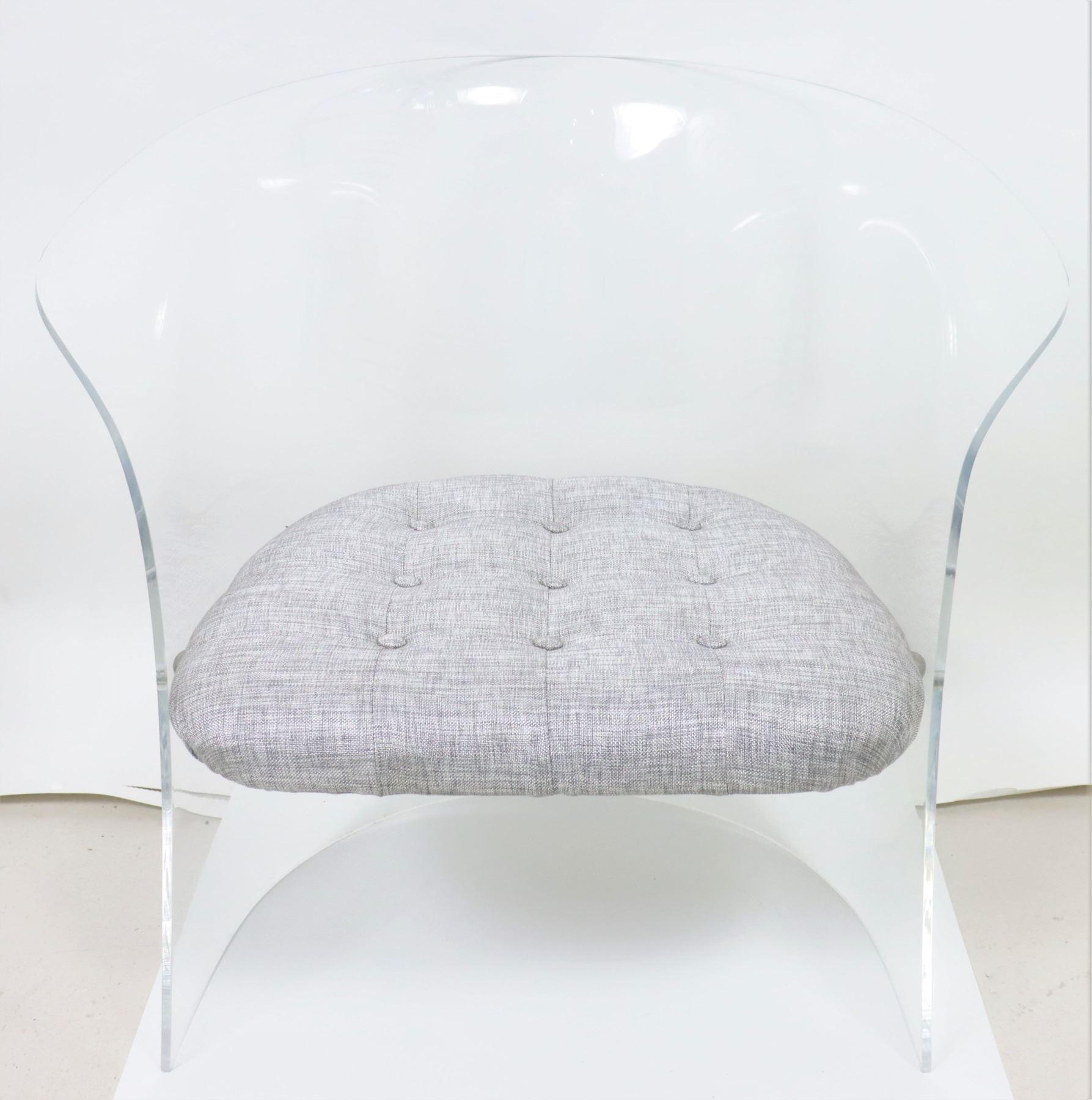 Clear molded lucite chair, barrel back form, with tufted seat, stainless side accents. Minor scratches.