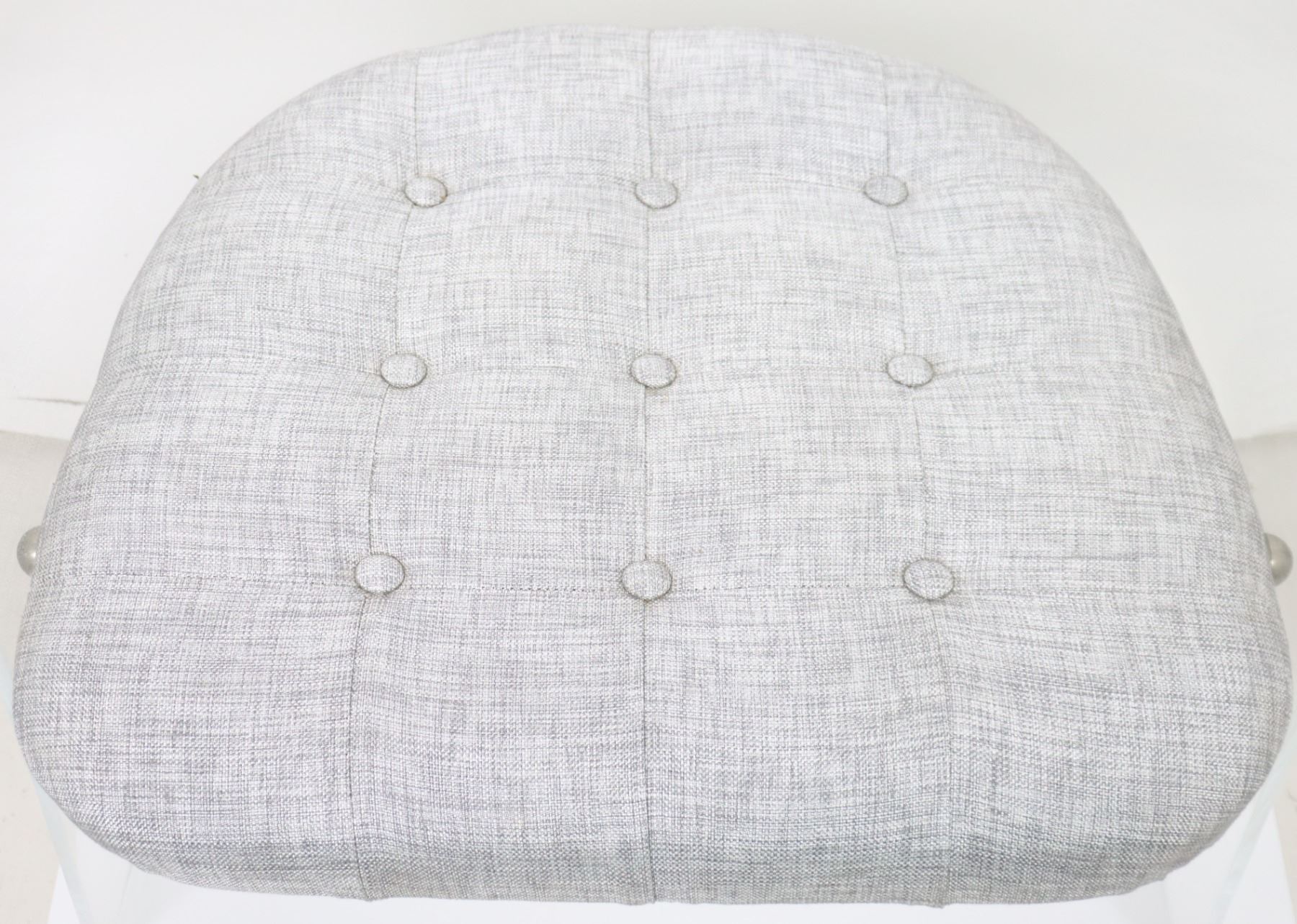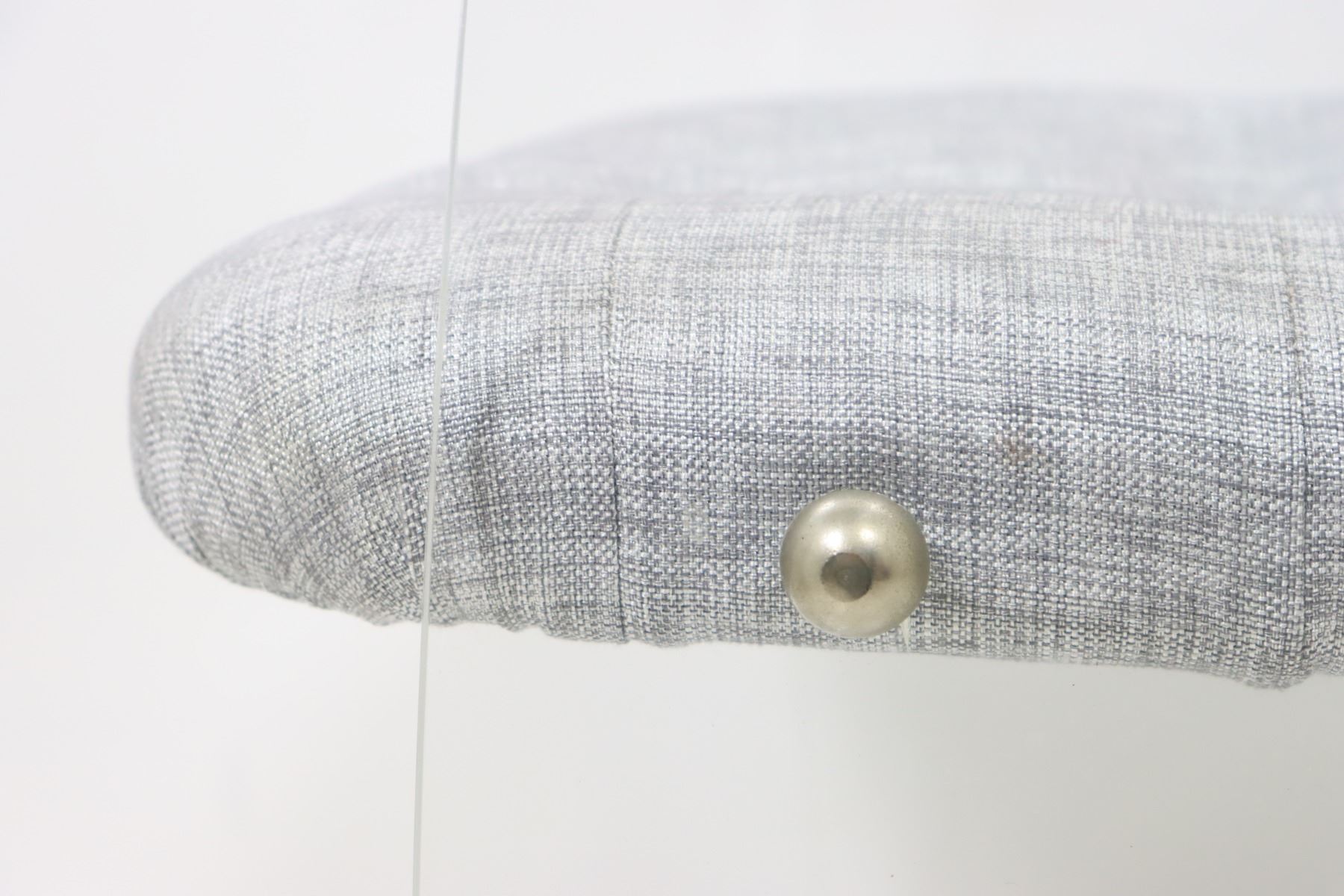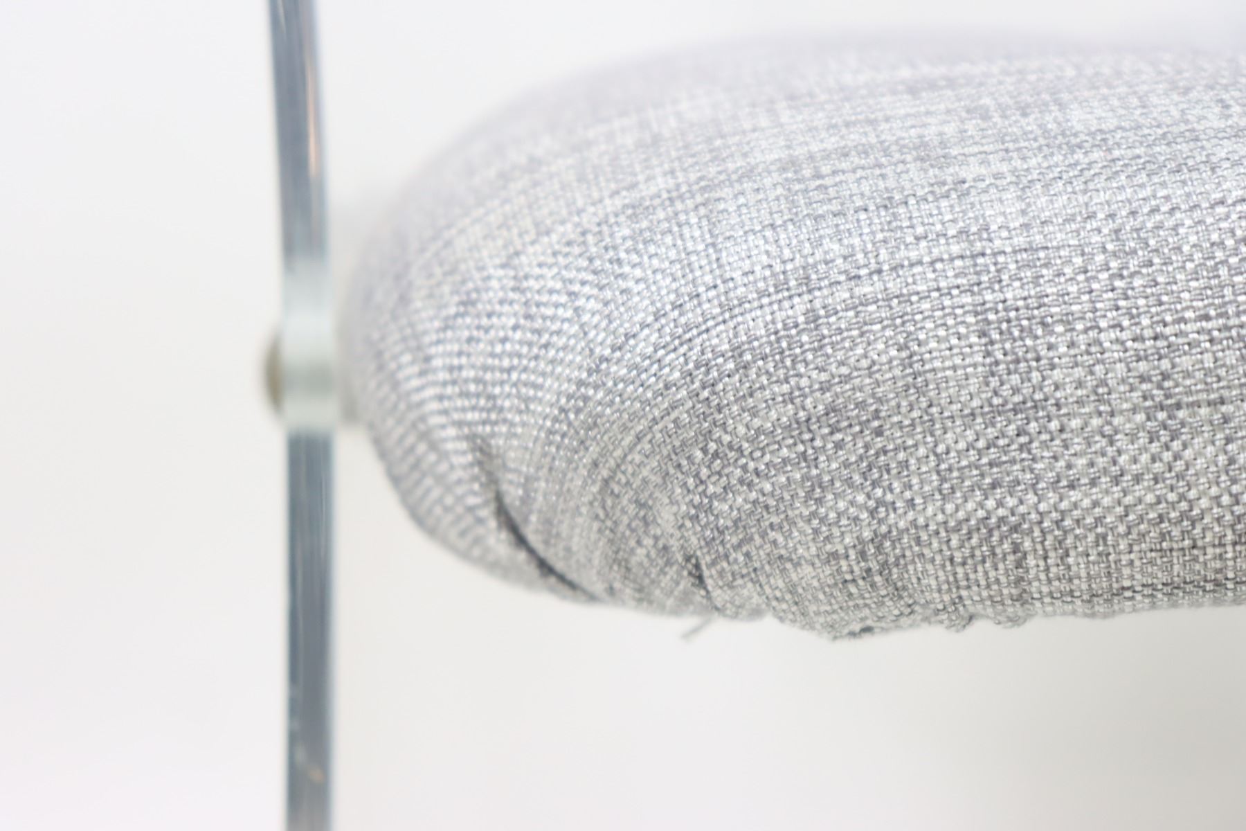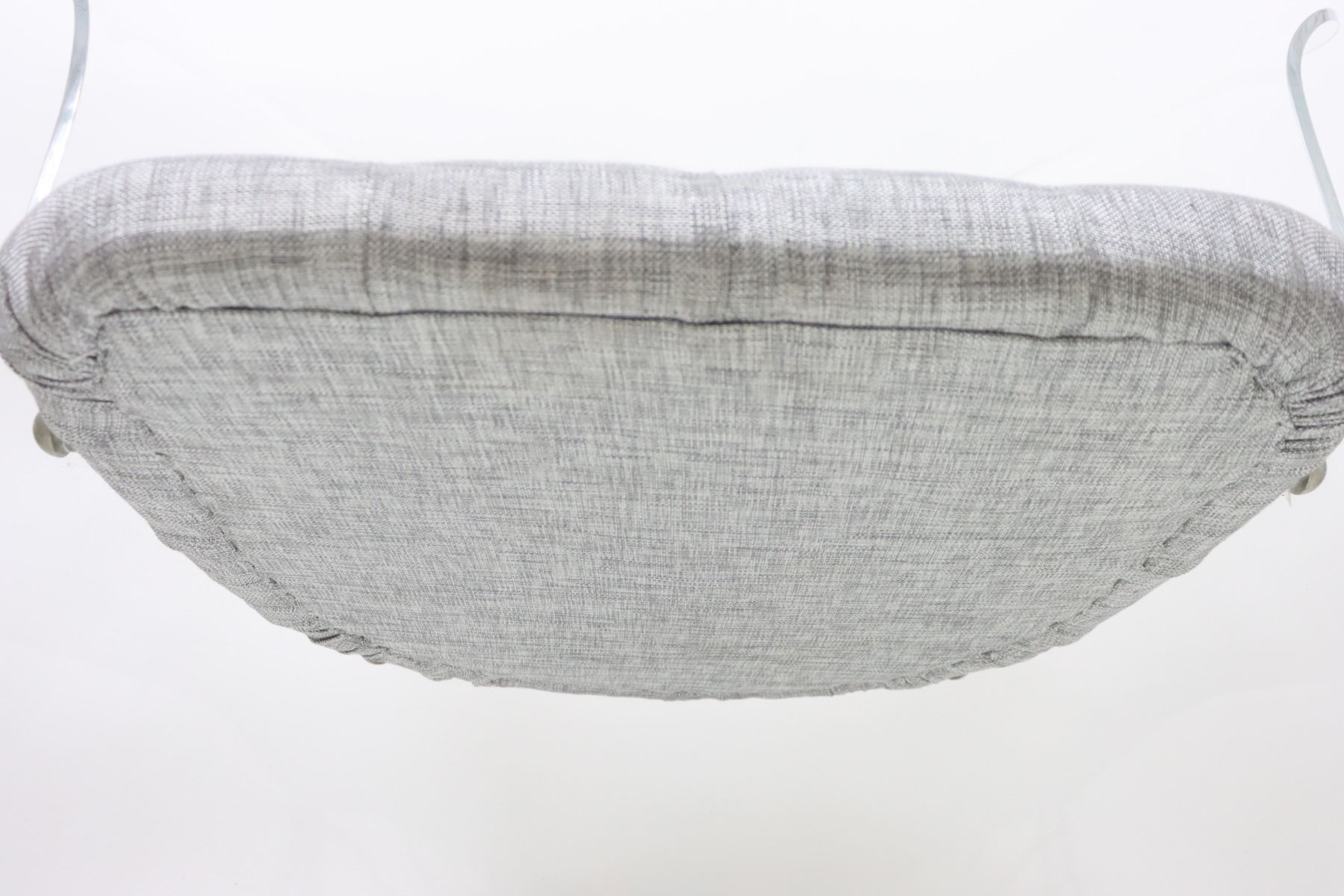 Clear molded lucite chair, barrel back form, with tufted seat, stainless side accents. Minor scratches.