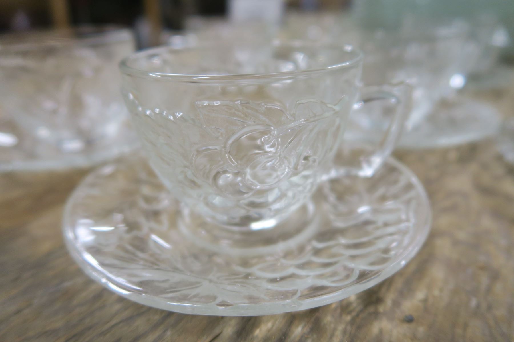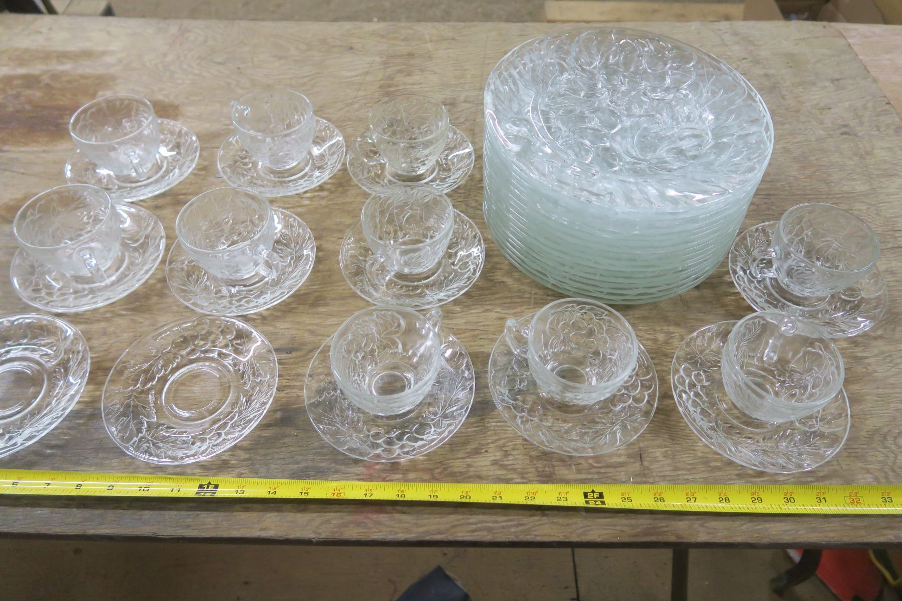 Clear Pressed Glass Set - 16 Large Plates, 12 Saucers and 10 Teacups