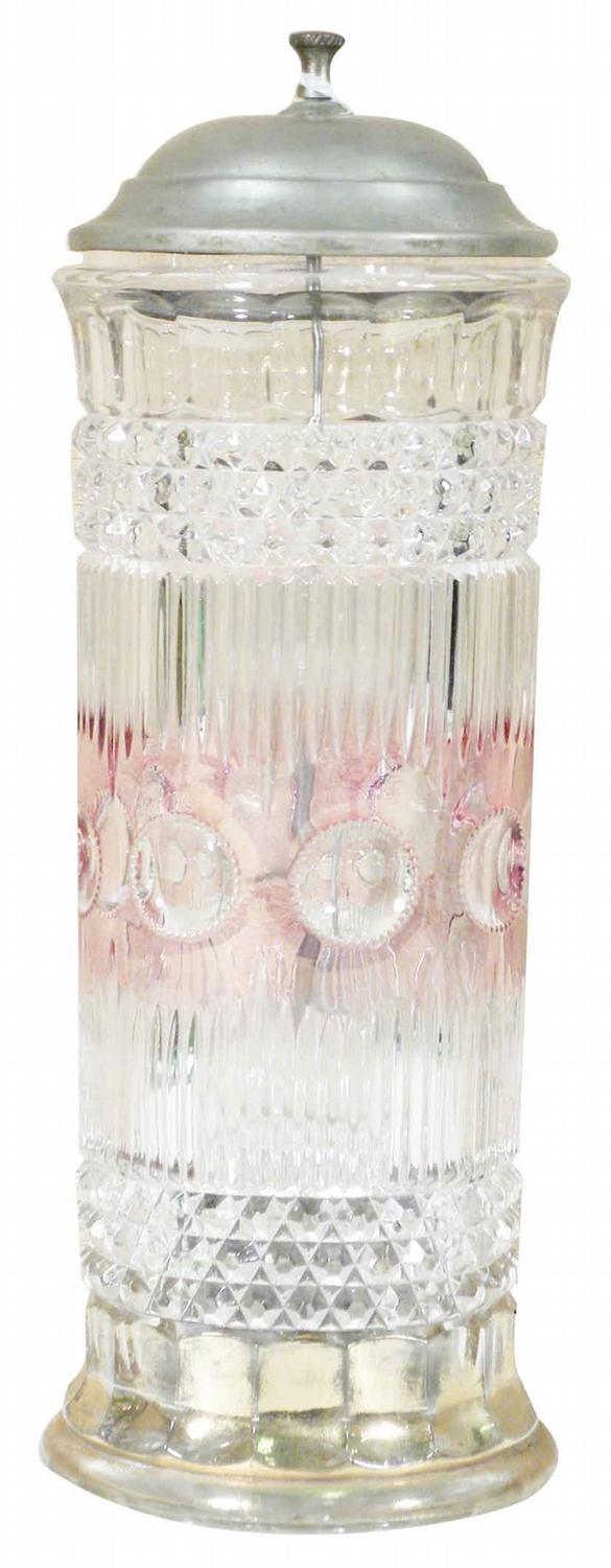 Clear Pressed Glass Straw Holder with cranberry belt and gold base. Elevator lid. No chips or cracks. 11 inches tall.