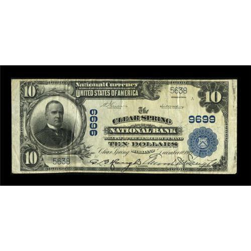 <B>Clear Spring, MD</B></I> - $10 1902 Plain Back Fr. 627 <B>The Clear Spring NB</B></I> Ch. # 9699<BR> The paper is problem free and attractive with perfect penned signatures. Only five large size notes are known from this institution, with the last auction appearance in 2003. <B>Very Fine.</B></I><BR><BR><b>Shipping:</b> Coins & Currency (<a target="_blank" href="http://www.heritageauctions.com/common/shipping.php">view shipping information</a>)
