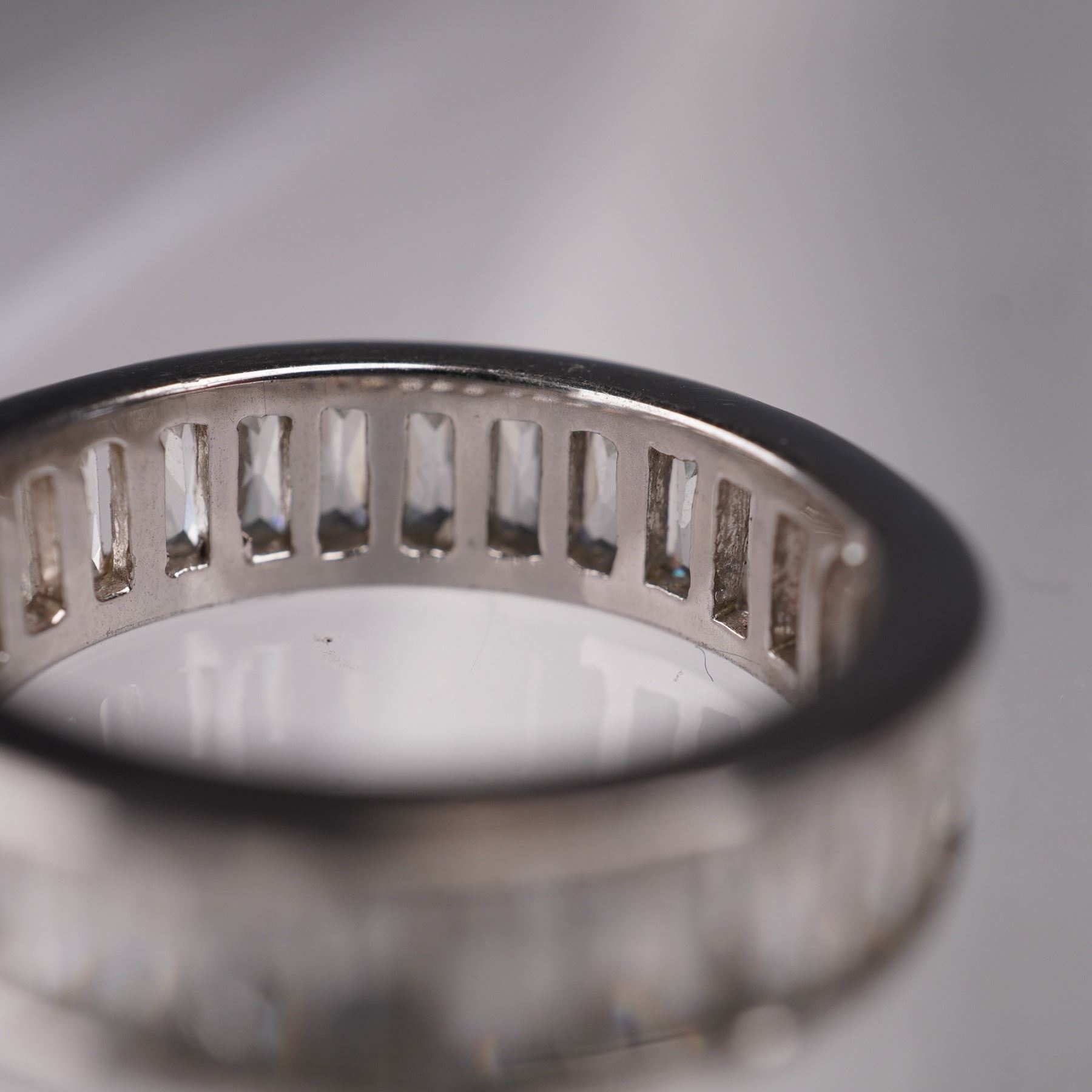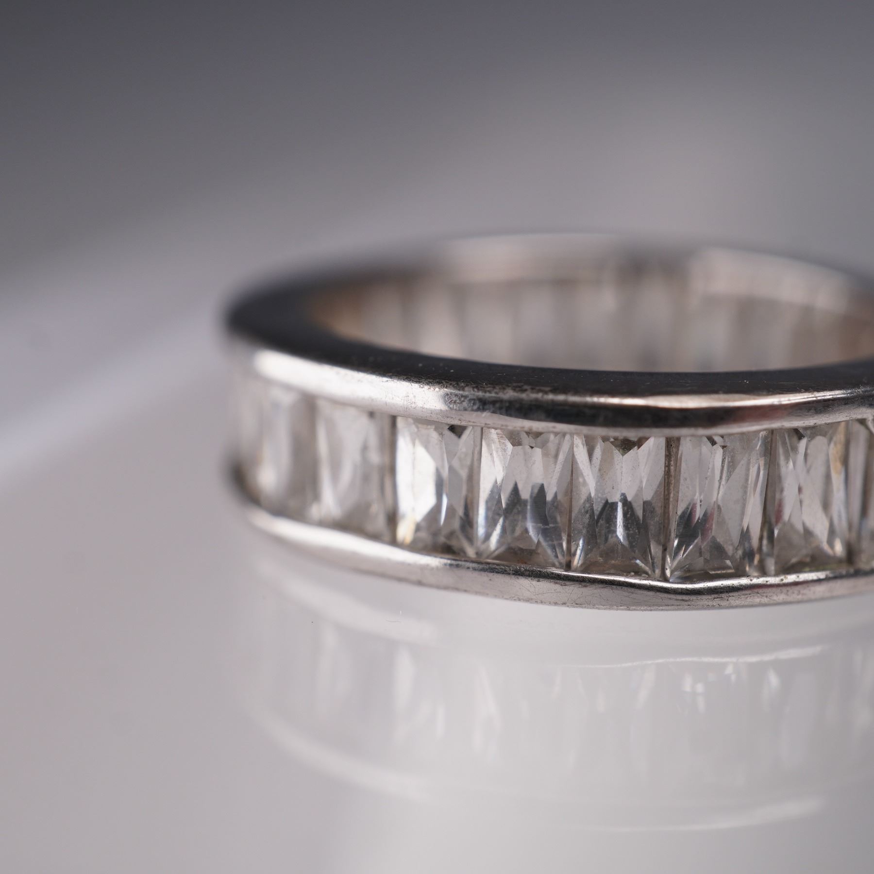 Presented is a stylish eternity band ring featuring a continuous row of clear rectangular faceted stones set in channel mount. The modern, streamlined design allows light to catch across the entire band for an eye-catching sparkle. This versatile piece works well for stacking or as a stand-alone accent. Weight: 4.47g.