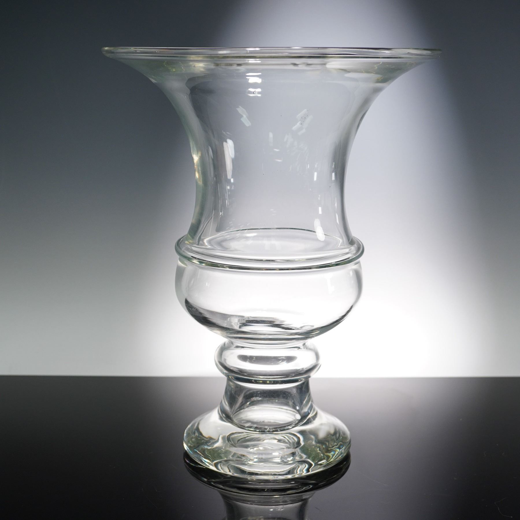 This elegant clear art glass vase features a beautifully flared rim, a smooth rounded body, and a distinctive tiered stem with stacked orb details above a wide circular base. The piece demonstrates fine craftsmanship in its symmetry and weight, offering both sculptural presence and functional elegance.