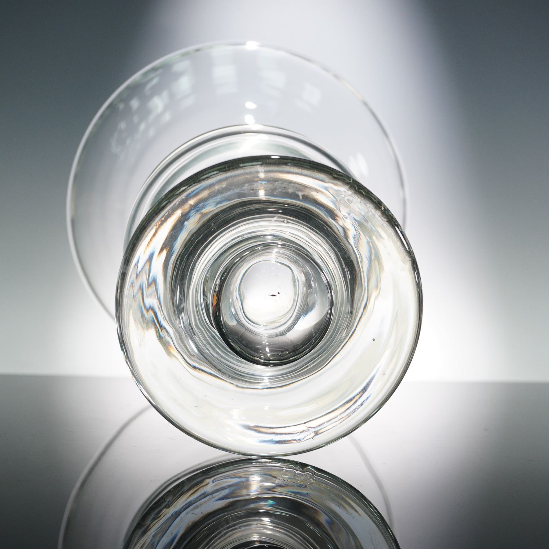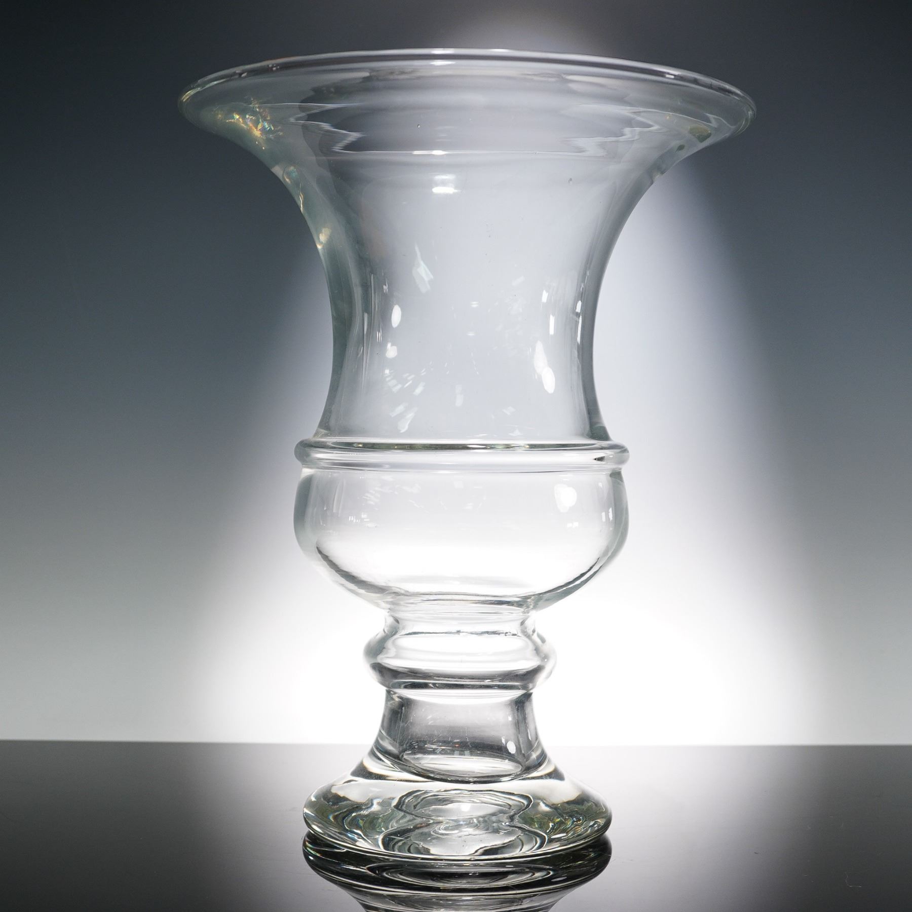 This elegant clear art glass vase features a beautifully flared rim, a smooth rounded body, and a distinctive tiered stem with stacked orb details above a wide circular base. The piece demonstrates fine craftsmanship in its symmetry and weight, offering both sculptural presence and functional elegance.