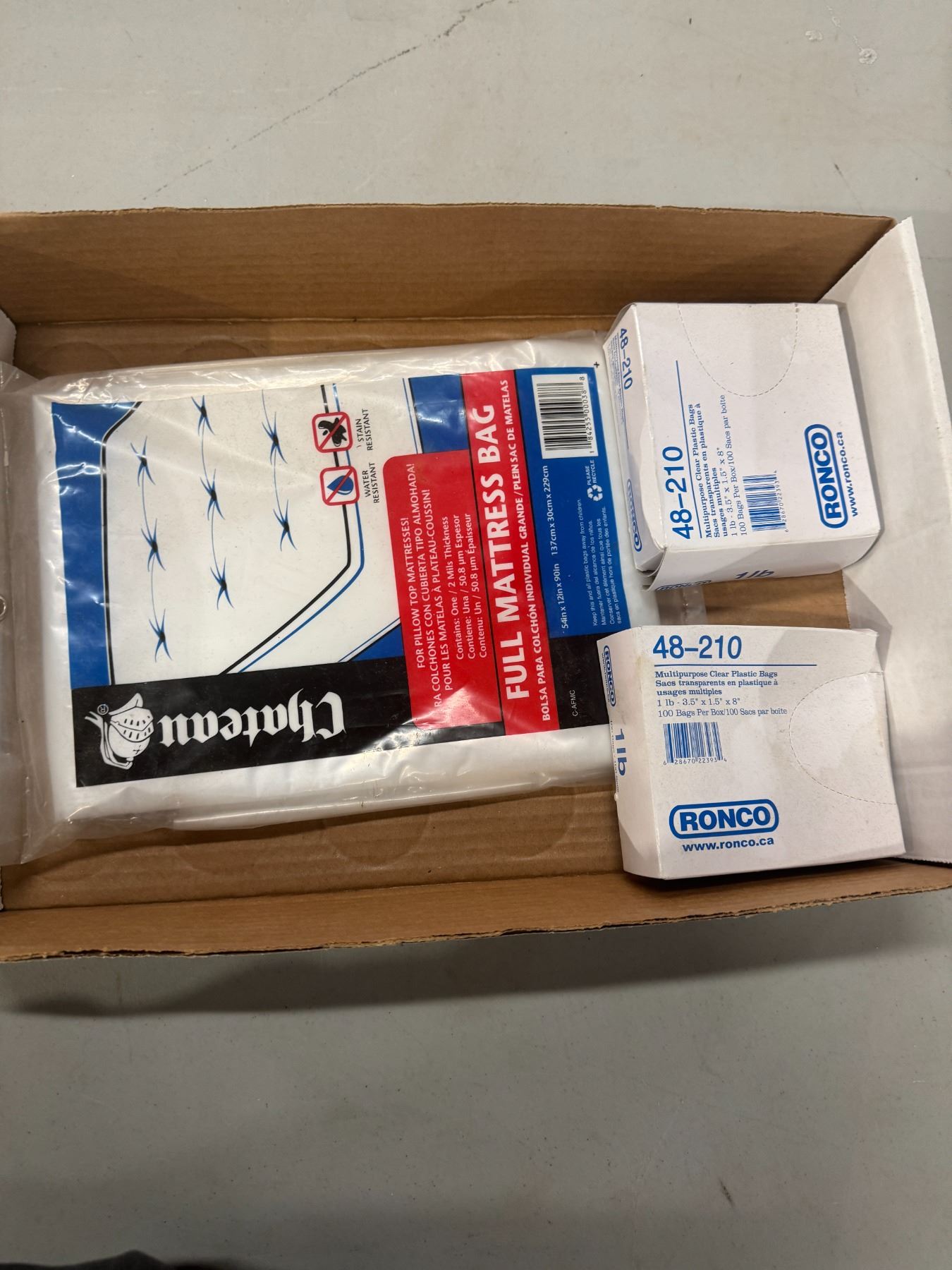 Clear plastic bags, 1 pound 3.5" x 1.5" x 8" and mattress protector bag