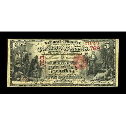 <B>Clearfield, PA</B></I> - $5 1875 Fr. 402 <B>The First NB</B></I> Ch. # 768<BR> A nice First Charter example from a bank which issued First Charters and Brown Backs only before exiting in 1891. <B>Fine-Very Fine,</B></I> with plenty of eye appeal and no flaws whatever for the grade. <BR><I>From The Walla Walla Collection</B></I><BR><BR><b>Shipping:</b> Coins & Currency (<a target="_blank" href="http://www.heritageauctions.com/common/shipping.php">view shipping information</a>)