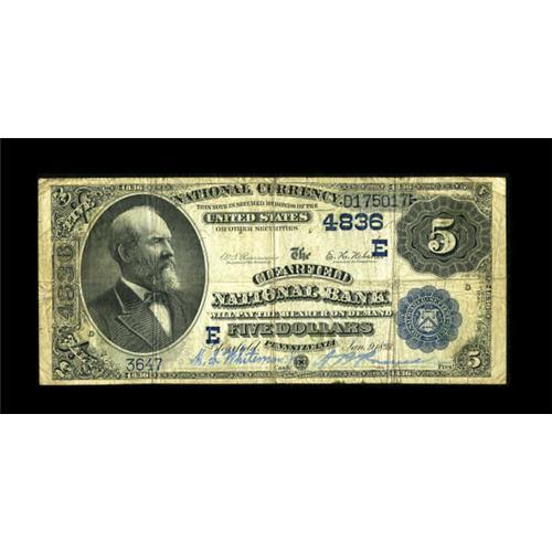 <B>Clearfield, PA</B></I> - $5 1882 Date Back Fr. 533 <B>The Clearfield NB</B></I> Ch. # (E)4836<BR> This piece has all the appearance of a full Fine. It is attractive and problem free save for a margin split. <B>Very Good-Fine.</B></I><BR><BR><b>Shipping:</b> Coins & Currency (<a target="_blank" href="http://www.heritageauctions.com/common/shipping.php">view shipping information</a>)