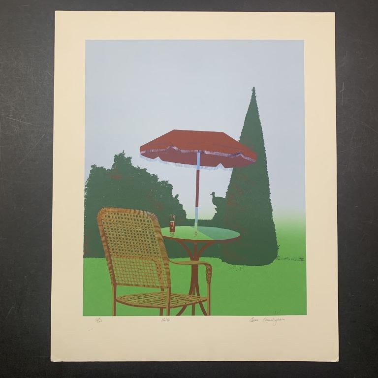 Cleave Cunningham's "Patio" limited edition print, signed lower right, titled lower middle, and numbered 149/300 lower left. This piece is of a patio chair and a small table with an umbrella attached, and a half full glass of water on the table. This piece is in near excellent condition with a miniscule crease lower right corner.