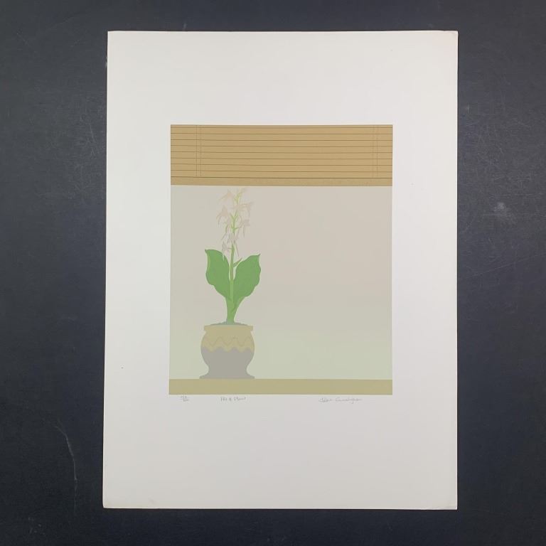 Cleave Cunningham's "Pot & Plant" limited edition print, signed lower right, titled lower middle, and numbered 154/300 lower left. This piece is of a scene of potted house plant, just underneath a window's blinds. This piece is in near excellent condition with miniscule creases/wrinkles in the upper right and lower right corners.