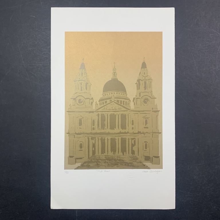 Cleave Cunningham's "St. Paul's" limited edition print, signed lower right, titled lower middle, and numbered 152/300 lower left. This piece is of the front of St. Paul's church, done in a muted type style. This piece is in excellent condition.