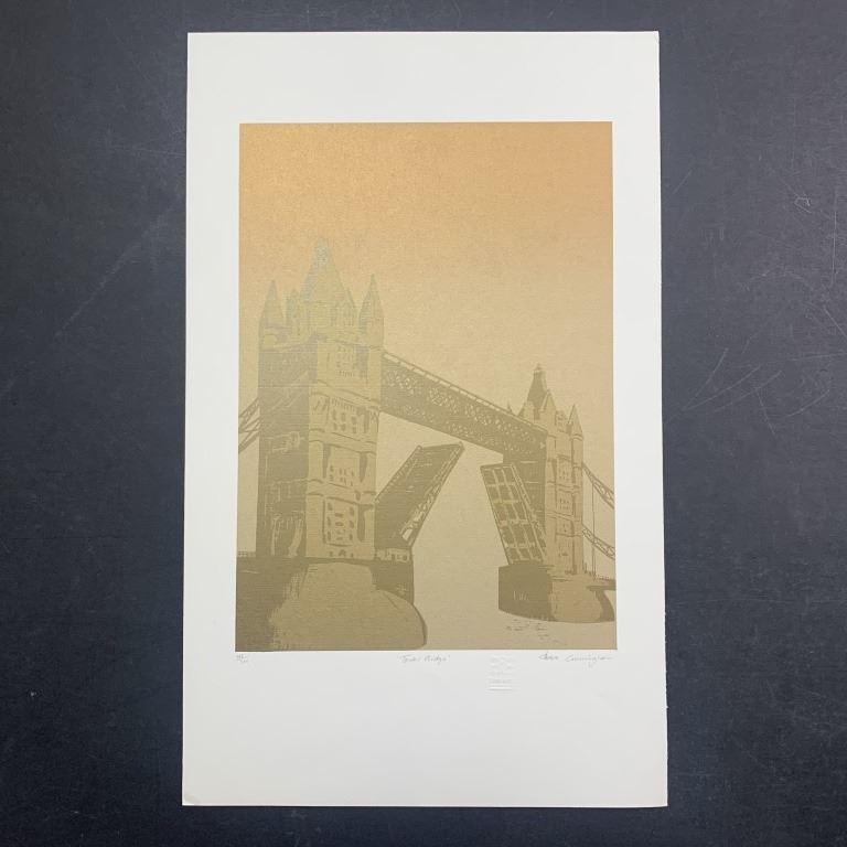 Cleave Cunningham's "Tower Bridge" limited edition print, signed lower right, titled lower middle, and numbered 166/300 lower left. This piece is of a bridge in between two buildings, done in a muted type style. This piece is in excellent condition.