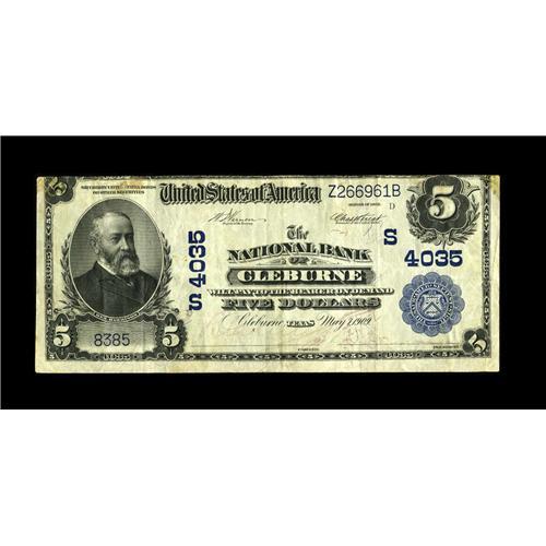 <B>Cleburne, TX</B></I> - $5 1902 Plain Back Fr. 600 <B>The NB</B></I> Ch. # (S)4035<BR>This $5 has several light folds. There are a few minor stains along the top edge and the signatures are visible. Nine Large are reported for this bank that closed in October 1921. <B>Very Fine.</B></I><BR><BR><b>Shipping:</b> Coin/Currency (<a target="_blank" href="http://www.heritageauctions.com/common/shipping.php">view shipping information</a>)