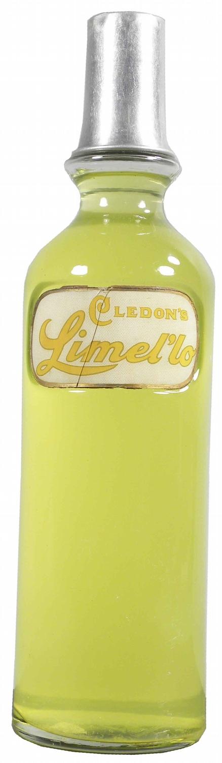 Cledon's Limel'lo Syrup Bottle, label under glass. Metal shot top lid. Vertical crack in label otherwise excellent condition. 12 1/2 inches tall.