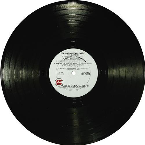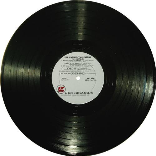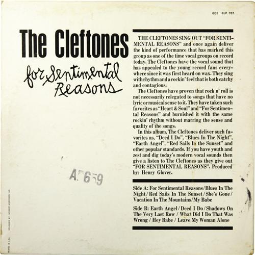 <B>Cleftones "For Sentimental Reasons" LP Gee 700 Mono (1962).</B></I> Second of two Gee albums by the R&B vocal group, and both are tough ones to find. There's a minor ink stain and a number stamped on the back cover. Condition: EX 7/ NM 8.