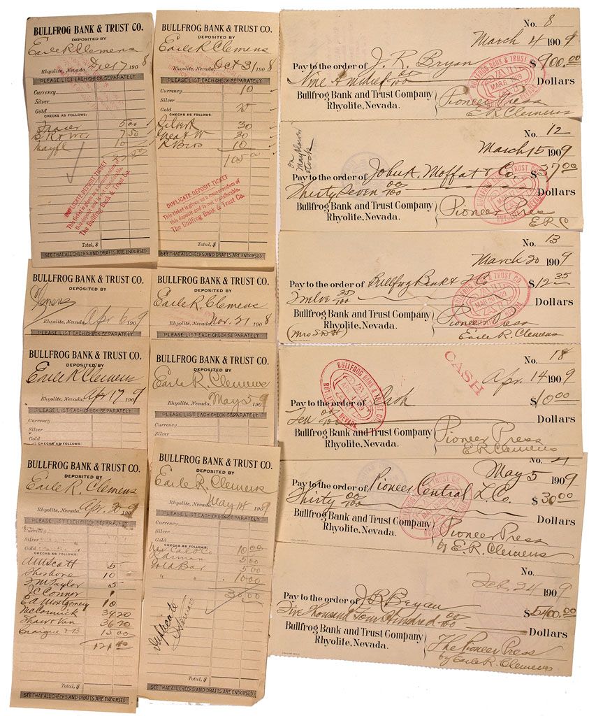 1908-1909 - Lot of 17. Includes 6 bank checks drawn on Bullfrog Bank and Trust Co. 1). No. 8 issued March 4, 1909 to J.R. Bryan for $900. Signed Pioneer Press E.R. Clemens. Double ring "PAID" stamp at right. Endorsed. 2). No. 12 issued March 15, 1909 to John A. Moffat and Co. For $37. Signed "Pioneer Press E.R.C." Double ring PAID stamp at right. Stamp endorsed on reverse. 3). No. 13 issued March 20, 1909 to Bullfrog Bank and Co. For $12.35. Cut canceled. Signed Pioneer Press Earle R. Clemens. Double ring PAID stamp at right. 4). No. 18 issued April 14, 1909 to "cash." Signed by Clemens. 5). No. 21 issued May 5, 1909 to Pioneer Central L. Co. for $30. Signed by Clemens. Cut canceled. Double ring "PAID" stamp at center. Endorsed. 6). Unnumbered. Issued Feb. 24, 1909 to J.R. Bryan for $5400. Cut canceled. Endorsed on reverse. Also includes 11 deposit slips signed by Clemens for deposit to the Bullfrog Bank & Trust ca. 1908-09. Clemens began the Pioneer Press at the Herald plant in Rhyolite on 18 February 1909. The Pioneer was a four page Saturday issue weekly that was the rival of Theodore Lowe`s Pioneer Papers which ran a Wednesday issue weekly. Both were in competition for the mining camp of Pioneer, NV. The papers and the camp both went belly up by July [Ref: Lingefelter and Gash, The Newspapers of Nevada: A History and Bibliography, 1854-1979, 1984, p. 169].