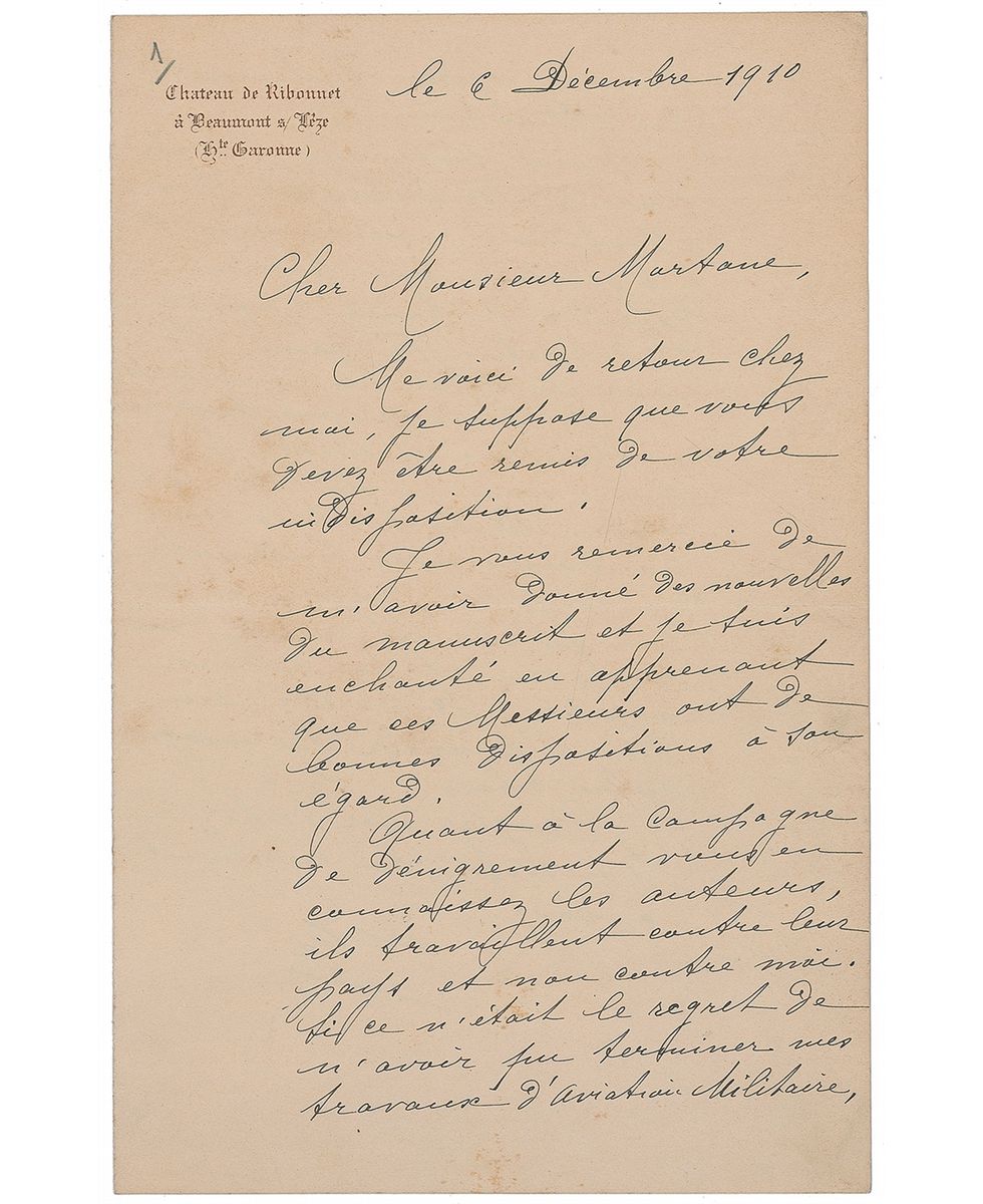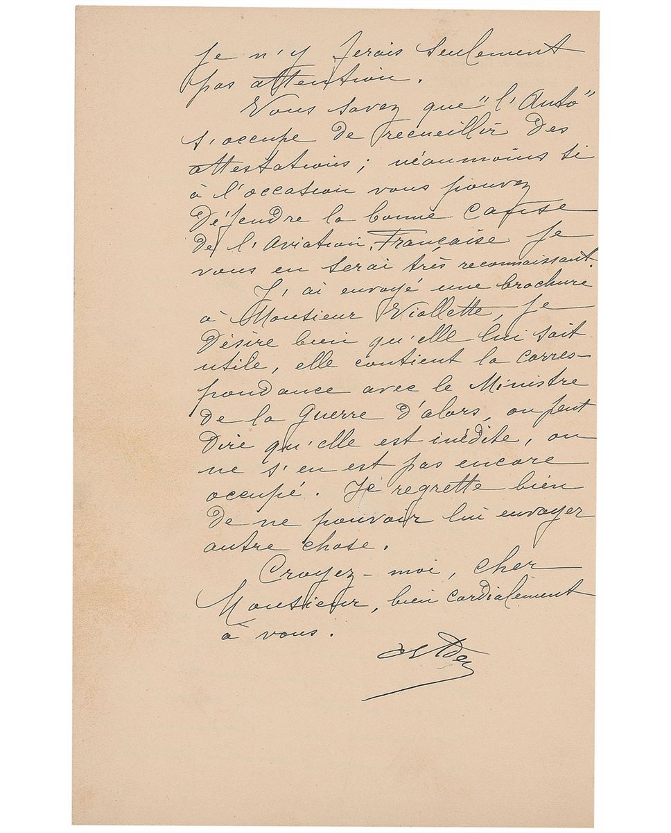 French engineer (1841–1925) best known for his pioneering work in aviation. Scarce ALS in French, signed “Ct Ader,” one page both sides, 5 x 8, Chateau de Ribonnet letterhead, December 6, 1910. Letter to Jacques Mortane, a writer and early champion of aviation, in full (translated): “I’m back to my home and I hope you have recovered from your disposition. I thank you for having given me news about my manuscript, and I am delighted to learn that these gentlemen have now good intentions regarding it. Regarding the defamation campaign, you know their ways, they work against their country and not just against me. If it were not for my regret of not having been able to finish my works on military aviation, I wouldn’t even care for them. You know that the magazine L’Auto is occupied in gathering testimonies. Nevertheless, if you can occasionally defend the good cause of French aviation I would be very grateful to you. I have sent a brochure to Mr. Viollette, and I hope it will be useful to him. It contains the correspondence with the Minister of War at the time and we can say it is unpublished. I very much regret not being able to send you anything else.” In fine condition, with some very subtle foxing. Thirteen years after the French army withdrew its funding for Ader’s Avion III—a four-propellered, bat-like structure powered by steam engines—the pioneering aviator found himself at the center of bad publicity. In 1910, under pressure to verify that there was no conflicting claim of ‘first flight’ following the Wright brothers’ success, the French commission released their official reports on Ader’s attempted flights, emphasizing his failure. Reaching out to journalist Jacques Mortane to “defend the good cause of French aviation,” this is a remarkable letter from the early days of flight—one of only a small handful by Ader we have offered.