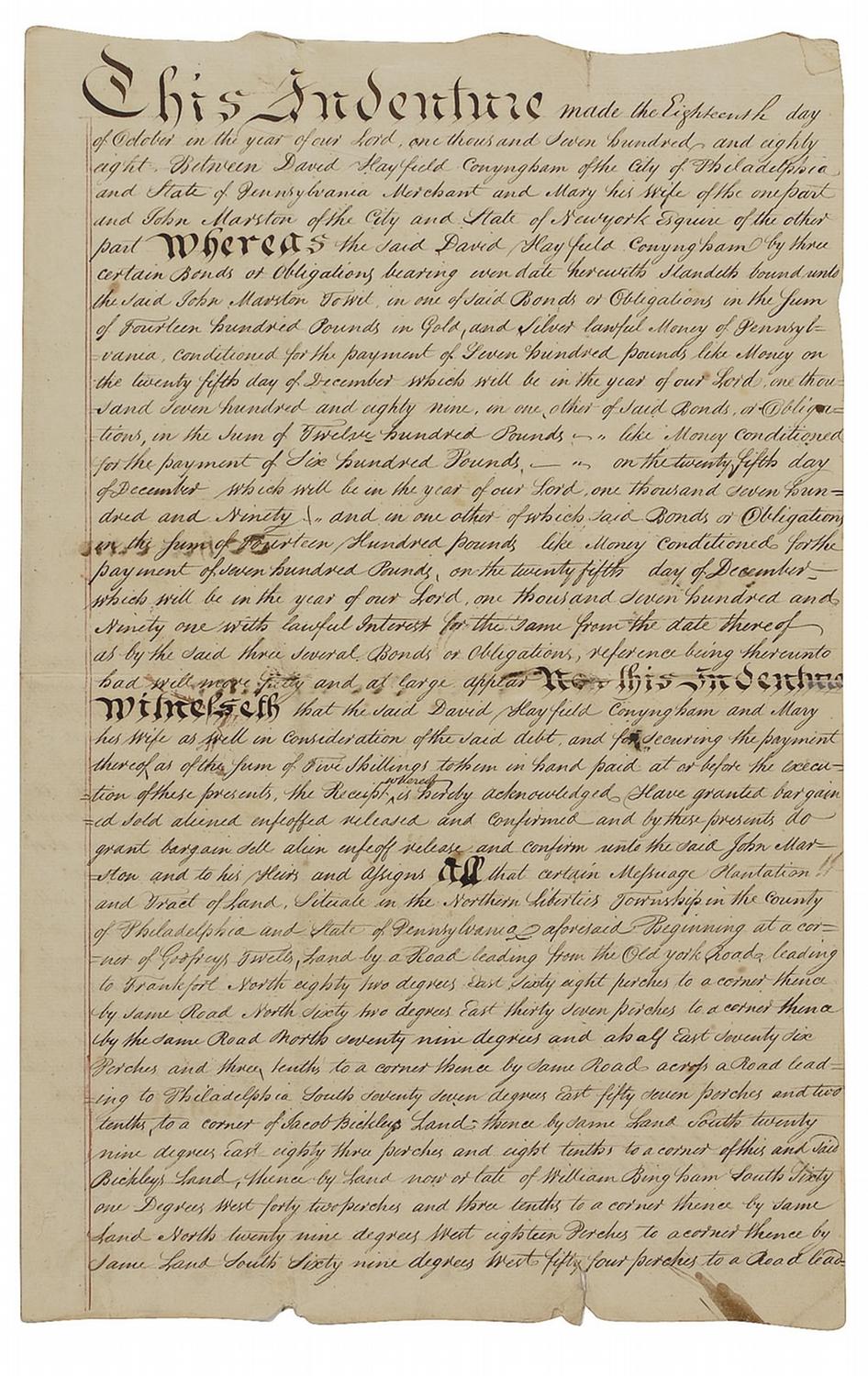 American Revolutionary soldier (1740–1815) who helped organize the ‘Quaker Blues,’ a company of volunteers. After the war Biddle served as a US marshal in Pennsylvania and made his living as a Philadelphia importer. DS, signed “Clement Biddle,” three pages on two adjoining sheets, 10.75 x 17, October 18, 1788. An indenture for a parcel of land in Philadelphia. Biddle has boldly signed at the conclusion of the document. In very good condition, with partial separations along horizontal folds, scattered light creasing and wrinkling, some scattered soiling and toning, and faint mirroring from words on the opposite page touching his signature.