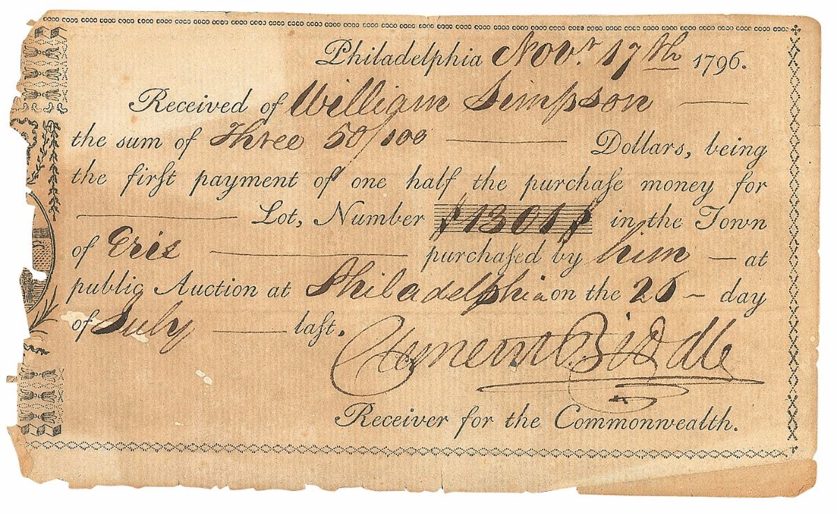 American Revolutionary soldier (1740–1814) who helped organize the ‘Quaker Blues,’ a company of volunteers. Partly-printed DS, one page, 6 x 3.75, November 17, 1796. Official Commonwealth of Pennsylvania pay receipt. In part: “Received of William Simpson the sum of Three 50/100 Dollars, being the first payment of one half the purchase money for Lot, Number ‘1301’ in the Town of Erie purchased by him at public Auction.” In very good condition, with irregular toning, overall brittleness, chipping to edges, and a tiny hole at the bottom of one letter in the signature.