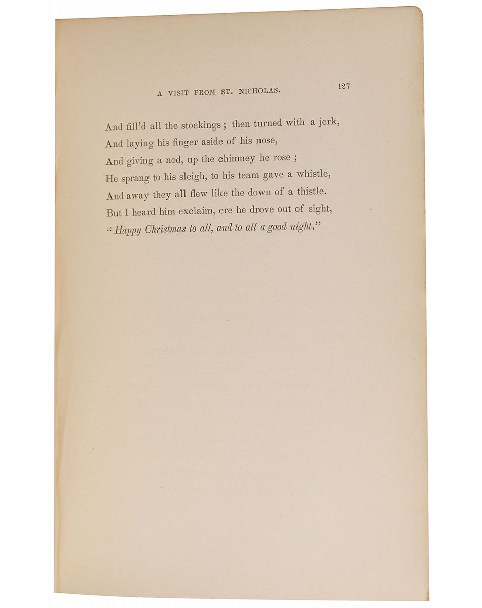 This volume contains Moore’s classic poem ‘A Visit from St. Nicholas,’ beginning with the iconic line, “’Twas the night before Christmas, when all through the house.” Appearing on pages 124–127, it is the very first appearance of the poem in a collection dedicated entirely to his own verse. Moore had initially written it for his children and recited it to them on Christmas Eve in 1822, and ‘A Visit from St. Nicholas’ was first published anonymously in the Troy Sentinel on December 23, 1823. It quickly became popular among readers and was soon published in anthologies, including The New York Book of Poetry in 1837 and in Bryant’s Selections from the American Poets in 1840. However, it was not until 1844—with this first edition of Moore’s Poems—that ‘A Visit from St. Nicholas’ was acknowledged in print as having been written by Clement C. Moore. The recipient of this author’s presentation copy, Friedrich von Gerolt, was the Prussian minister plenipotentiary to the United States, still regarded as the longest-serving ambassador of Germany to the US with over 25 years of service. This is an especially appropriate association, considering the elements of the American Santa Claus derived from Germanic tradition. A magnificent and exceedingly scarce presentation copy.