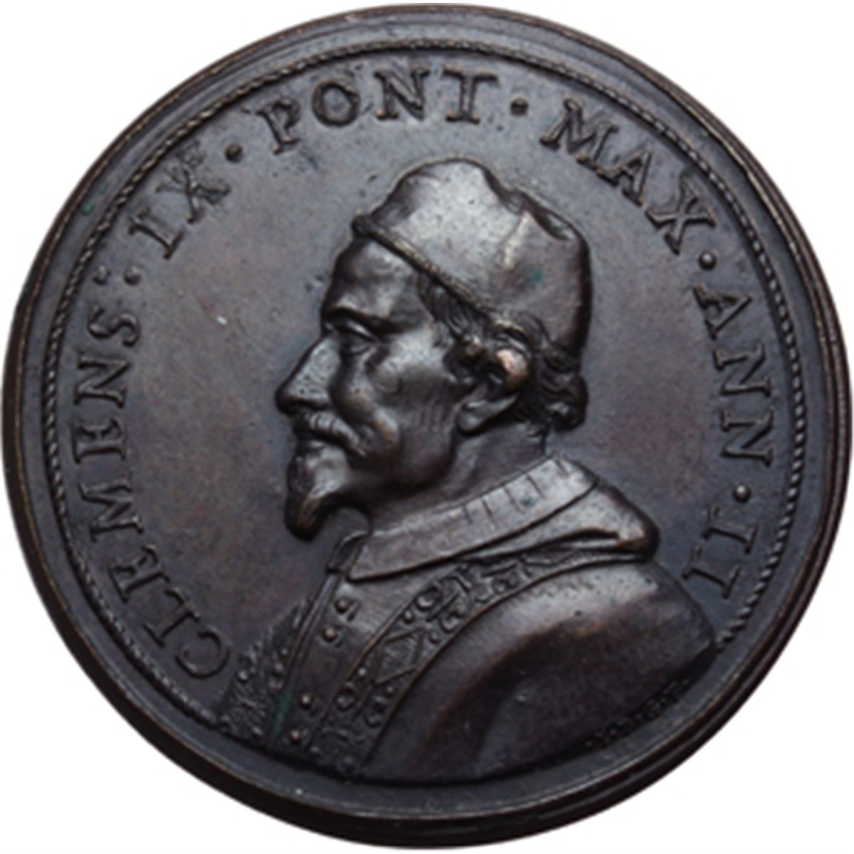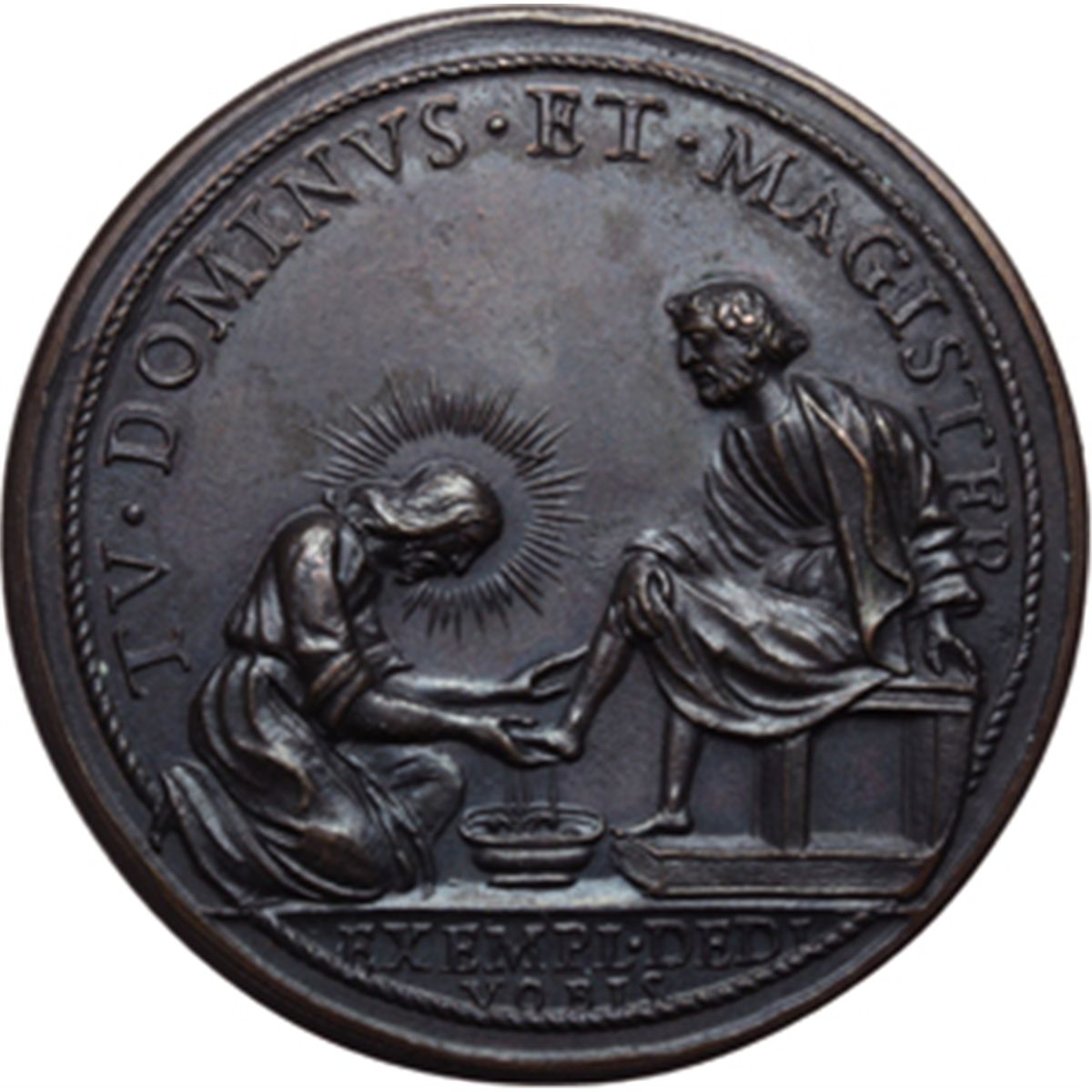 Medaglie Papali. Clemente IX (1667-1669), Giulio Girolamo Rospigliosi. Medaglia A. II. Lavanda dei piedi del Giovedv¨ Santo. D/ Busto a sinistra con camauro, mozzetta e stola. R/ Lavanda. Spink 1268. Miselli 696. AE. mm. 41.50 Inc. Giovanni Battista Guglielmada. R. FDC.